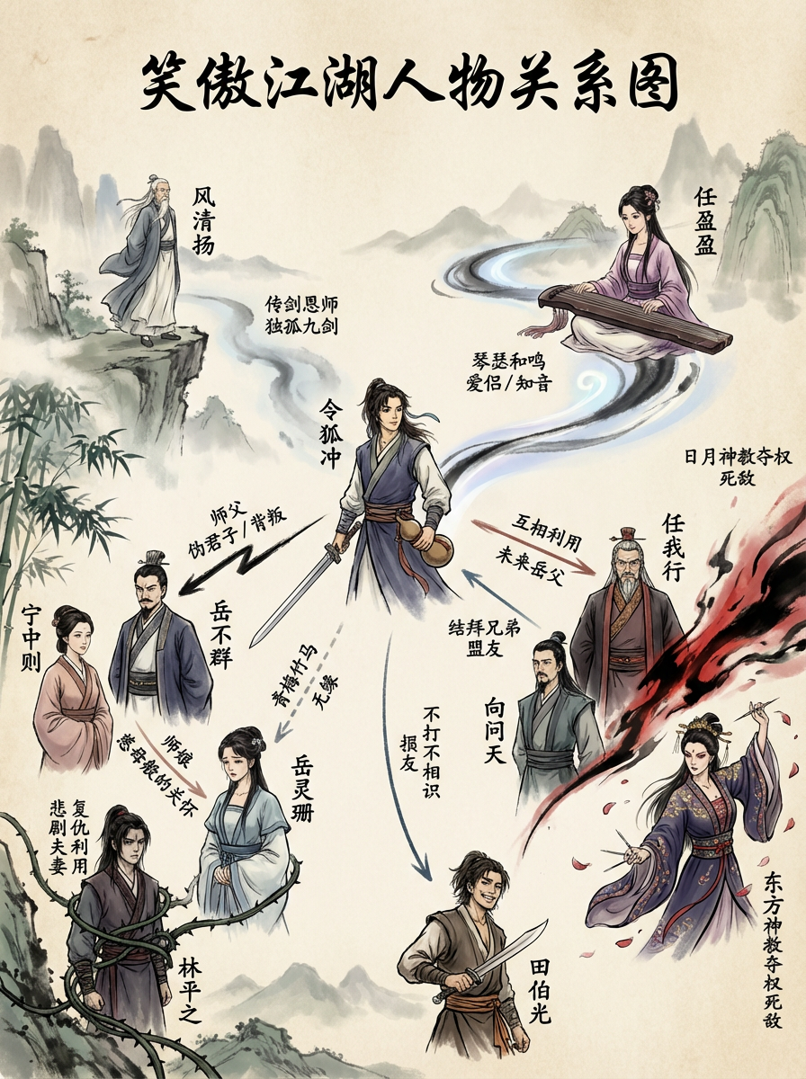 画一个金庸小说笑傲江湖主要人物关系的信息图,风格与小说意境一致,使用中文。