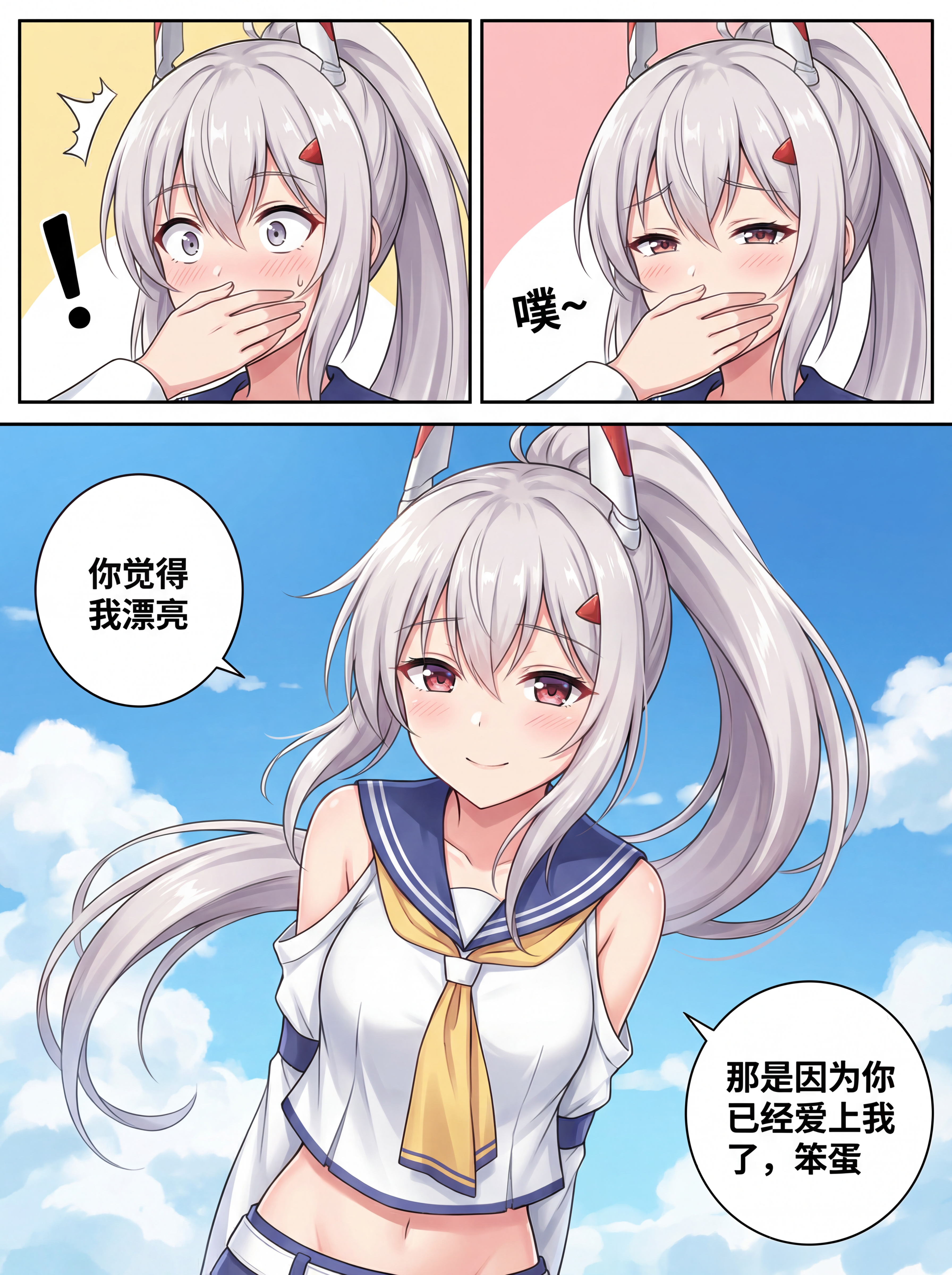 生成一张三格漫画,画面上方三分之一处的左半部分是第一格,右半部分是第二格,画面下方占总画面三分之二的位置是第三格。要求人物长相服装与参考图完全一致。第一格为人物的面部特写,眼睛睁大,眼神中带着一丝惊讶,嘴巴被一只手轻轻捂住,旁边配有一个 “!” 的符号,整体神态呈现出意外、略带羞怯的感觉,动作上是单手掩口,姿态显得较为娇俏。第二格也是人物的面部特写,眼睛眯起,呈现出笑意,嘴巴微张,那只捂住嘴的手还保持着动作,同时有 “噗~” 的拟声词,神态是开心、俏皮的,仿佛是忍不住要笑出声,动作上延续了掩口的姿态,却多了几分活泼的情绪。第三格背景是有云朵的天空,画面只出现了人物的上半身,人物画风与参考图完全一致。人物的发丝被风吹起,眼睛弯弯,面带柔和的笑容,脸颊还有淡淡的红晕。她姿态放松,身体略向前倾,双手背在身后,整体神态是自信且温柔,呈现出一种大方又迷人的状态。第三格左边有圆形对话框,写着“你觉得我漂亮”。右侧下方有圆形对话框,写着“那是因为你已经爱上我了,笨蛋”。注意人物是高马尾,不是双马尾,不是侧马尾,也不是直发,头上的装饰物不要去掉,捂嘴的手和人物完全一致。