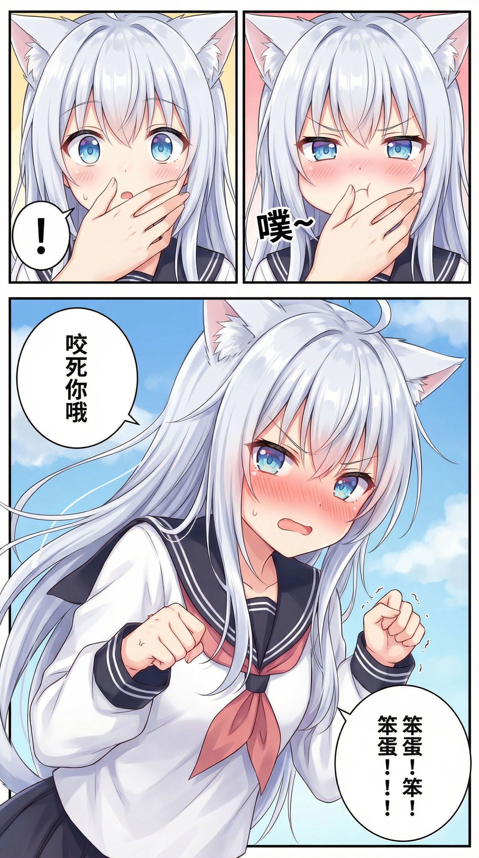 参考图细节:角色是一只猫娘,蝴蝶结系在尾巴上。\n生成一张三格漫画,画面上方三分之一处的左半部分是第一格,右半部分是第二格,画面下方占总画面三分之二的位置是第三格。要求人物长相服装与参考图完全一致。第一格为人物的面部特写,眼睛睁大,眼神中带着一丝惊讶,嘴巴被一只手轻轻捂住,旁边配有一个 “!” 的符号,整体神态呈现出意外、略带羞怯的感觉,动作上是单手掩口,姿态显得较为娇俏。第二格也是人物的面部特写,眼神气鼓鼓,那只捂住嘴的手还保持着动作,同时有 “噗~” 的拟声词,神态是娇羞,脸红的,仿佛是要咬人,动作上延续了掩口的姿态,却多了几分娇羞的情绪。第三格背景是有云朵的天空,画面只出现了人物的上半身,人物画风与参考图完全一致。人物的发丝被风吹起,娇羞,面带恼羞成怒,脸颊红晕。她姿态紧张,身体略向前倾,双手握拳,摇摆,整体神态是娇羞恼羞成怒,呈现出一种害羞咬人炸毛的状态。第三格左边有圆形对话框,写着“咬死你哦”。右侧下方有圆形对话框,写着“笨蛋!笨蛋!笨蛋!!!”。