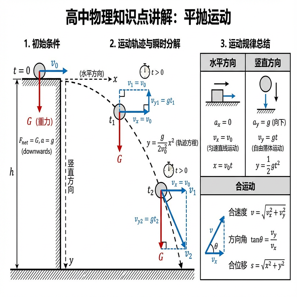 制作一个关于平抛运动的高中物理知识点讲解,一定要知识准确无误,有初始条件、运动轨迹与瞬时分解、运动规律总结等要素;力的分解使用不同的颜色绘画力线;如果是同个力,则相同颜色。