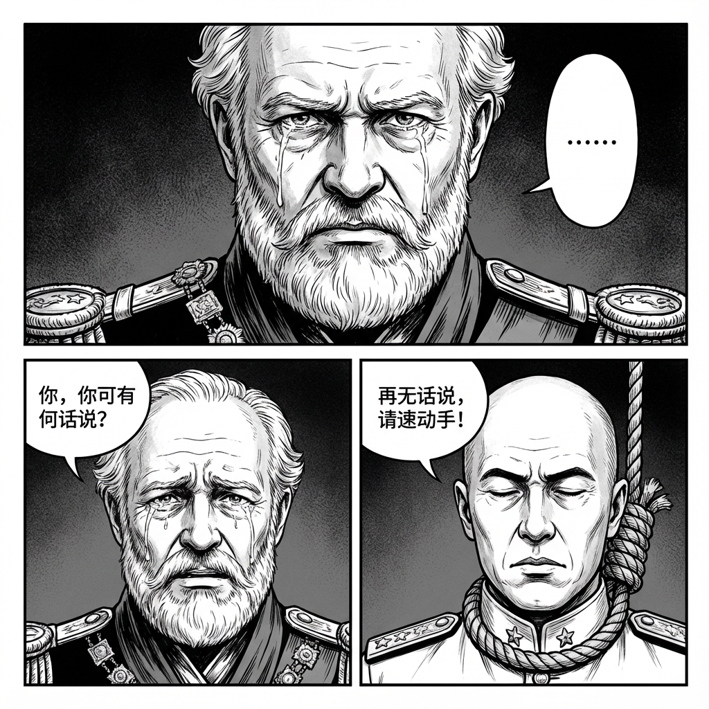 做一个三格漫画,最上边一行一格,下面一行左右两格。最上方格由第一张图的角色作为主角,角色流着眼泪,嘴巴却紧闭,幽怨的盯着镜头,对话框内:“……”。左下角的第二格依然由第一张图的角色作为主角,角色悔恨的流着眼泪,哭泣着询问:“你,你可有何话说?”。右下角的第三格由第二张图的角色作为主角,角色带着决绝的表情,有一根绳子从上方系在他的脖子上,他闭着眼神情庄重的回复到:“再无话说,请速动手!”,整体采用黑白画风,所有对话发生在对话框内,无重复内容,所有镜头以近身特写的方式表现,注意每格内的角色,我再次重复一遍,前两格为我发送的第一张图的角色,最后一格为我发送的第二张图的角色