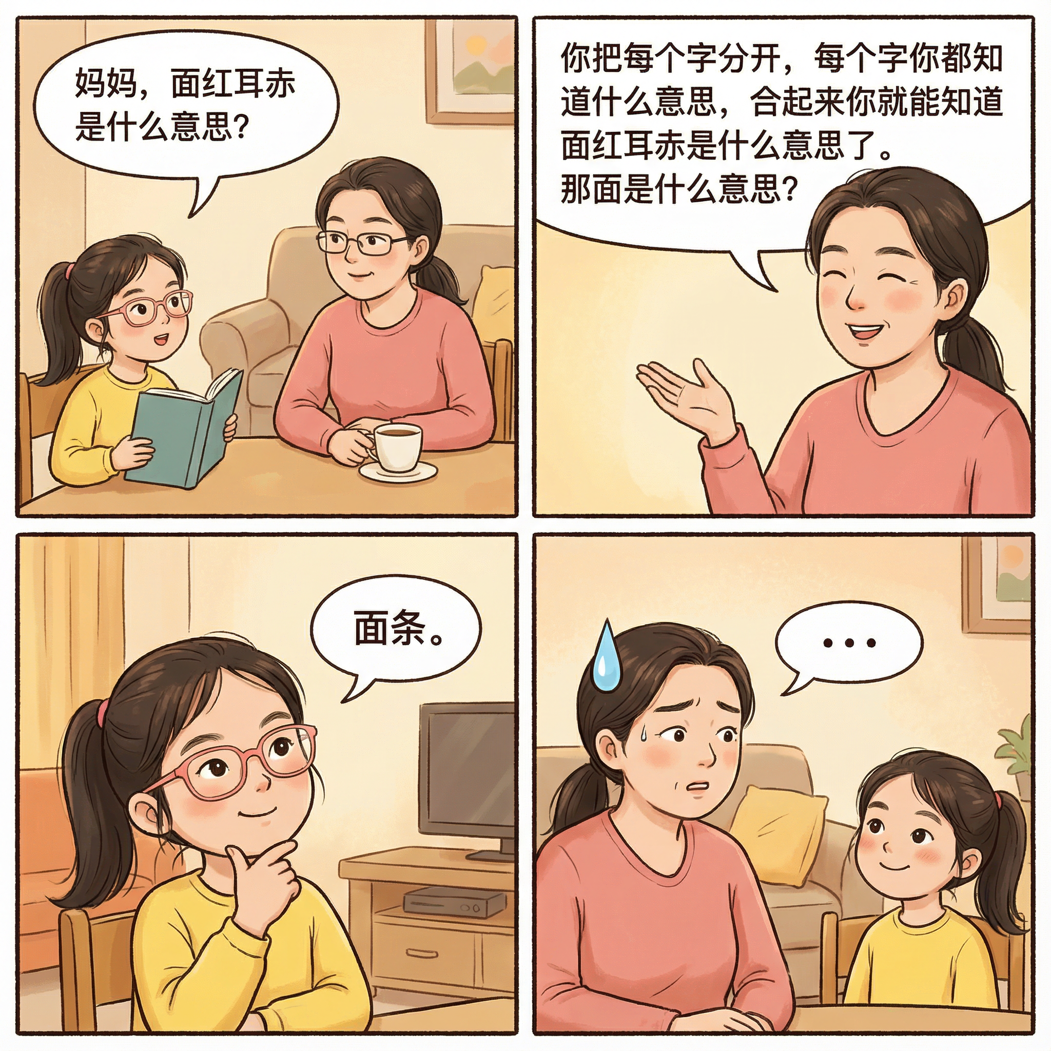 附件分别是妈妈和女儿的形象,请以她们的形象为模板,制作四格漫画,主要是以下内容:\n女儿:妈妈,面红耳赤是什么意思?妈妈:你把每个字分开,每个字你都知道什么意思,合起来你就能知道面红耳赤是什么意思了。那面是什么意思?女儿:面条。妈妈: ...