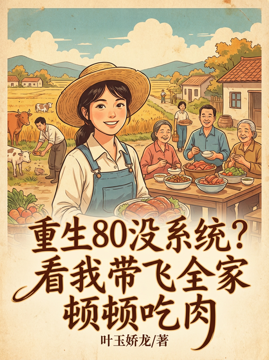 网文短剧爆款封面,80年代文封面,色调复古明亮,种田文女主,封面居中靠下艺术文字:“重生80没系统?看我带飞全家顿顿吃肉”、“叶玉娇龙/著”