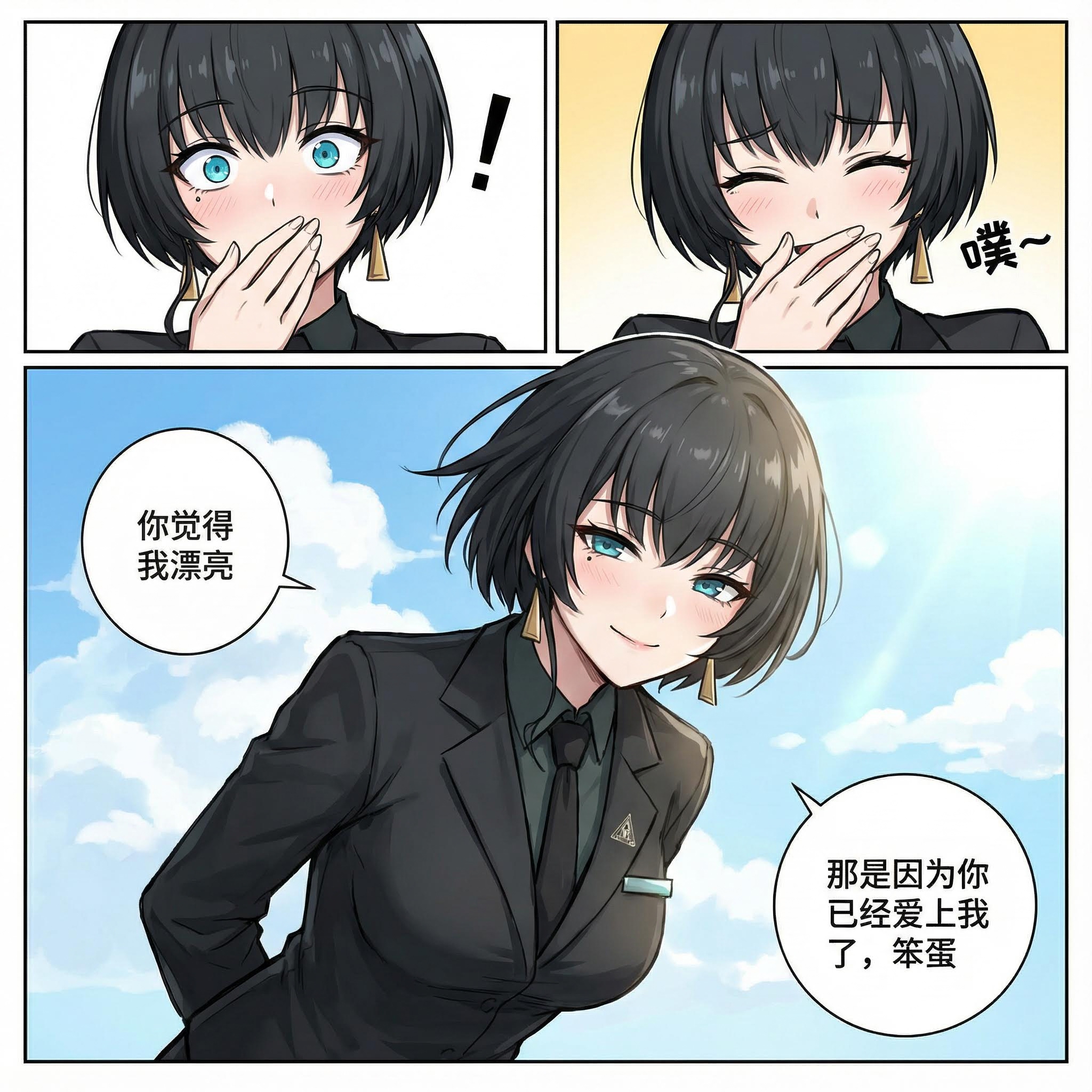 生成一张三格漫画,画面上方三分之一处的左半部分是第一格,右半部分是第二格,画面下方占总画面三分之二的位置是第三格。要求人物长相服装与参考图完全一致。第一格为人物的面部特写,眼睛睁大,眼神中带着一丝惊讶,嘴巴被一只手轻轻捂住,旁边配有一个 “!” 的符号,整体神态呈现出意外、略带羞怯的感觉,动作上是单手掩口,姿态显得较为娇俏。第二格也是人物的面部特写,眼睛眯起,呈现出笑意,嘴巴微张,那只捂住嘴的手还保持着动作,同时有 “噗~” 的拟声词,神态是开心、俏皮的,仿佛是忍不住要笑出声,动作上延续了掩口的姿态,却多了几分活泼的情绪。第三格背景是有云朵的天空,画面只出现了人物的上半身,人物画风与参考图完全一致。人物的发丝被风吹起,眼睛弯弯,面带柔和的笑容,脸颊还有淡淡的红晕。她姿态放松,身体略向前倾,双手背在身后,整体神态是自信且温柔,呈现出一种大方又迷人的状态。第三格左边有圆形对话框,写着“你觉得我漂亮”。右侧下方有圆形对话框,写着“那是因为你已经爱上我了,笨蛋”。
