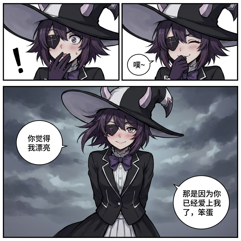 生成一张三格漫画,画面上方三分之一处的左半部分是第一格,右半部分是第二格,画面下方占总画面三分之二的位置是第三格。要求人物长相服装与参考图完全一致。第一格为人物的面部特写,眼睛睁大,眼神中带着一丝惊讶,嘴巴被一只手轻轻捂住,旁边配有一个 “!” 的符号,整体神态呈现出意外、略带羞怯的感觉,动作上是单手掩口,姿态显得较为娇俏。第二格也是人物的面部特写,眼睛眯起,呈现出笑意,嘴巴微张,那只捂住嘴的手还保持着动作,同时有 “噗~” 的拟声词,神态是开心、俏皮的,仿佛是忍不住要笑出声,动作上延续了掩口的姿态,却多了几分活泼的情绪。第三格背景是有云朵的天空,画面只出现了人物的上半身,人物画风与参考图完全一致。人物的发丝被风吹起,眼睛弯弯,面带柔和的笑容,脸颊还有淡淡的红晕。她姿态放松,身体略向前倾,双手背在身后,整体神态是自信且温柔,呈现出一种大方又迷人的状态。第三格左边有圆形对话框,写着“你觉得我漂亮”。右侧下方有圆形对话框,写着“那是因为你已经爱上我了,笨蛋”。\n(黑暗、丧气画风)