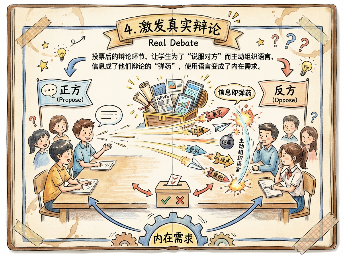 做出手帐风说明:4. 激发真实辩论: 投票后的辩论环节,让学生为了“说服对方”而主动组织语言,信息成了他们辩论的“弹药”,使用语言变成了内在需求。