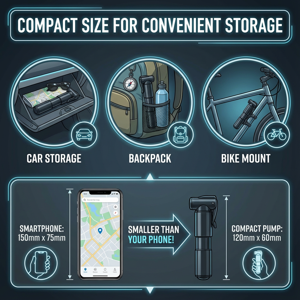 这张图片设计以“骑车充气泵,小巧便携”为核心卖点,采用分层布局清晰传递信息:顶部标题直接点明“COMPACT SIZE FOR CONVENIENT STORAGE”;中间通过车内、背包、悬挂在自行车把手上三种场景图,直观展示产品在不同场景的便捷存储与使用;下方结合手机尺寸对比(标注具体数值),量化凸显其“比手机更小”的小巧属性。整体以深色背景突出产品,多场景案例与尺寸可视化结合,信息层级明确,既直观呈现使用场景