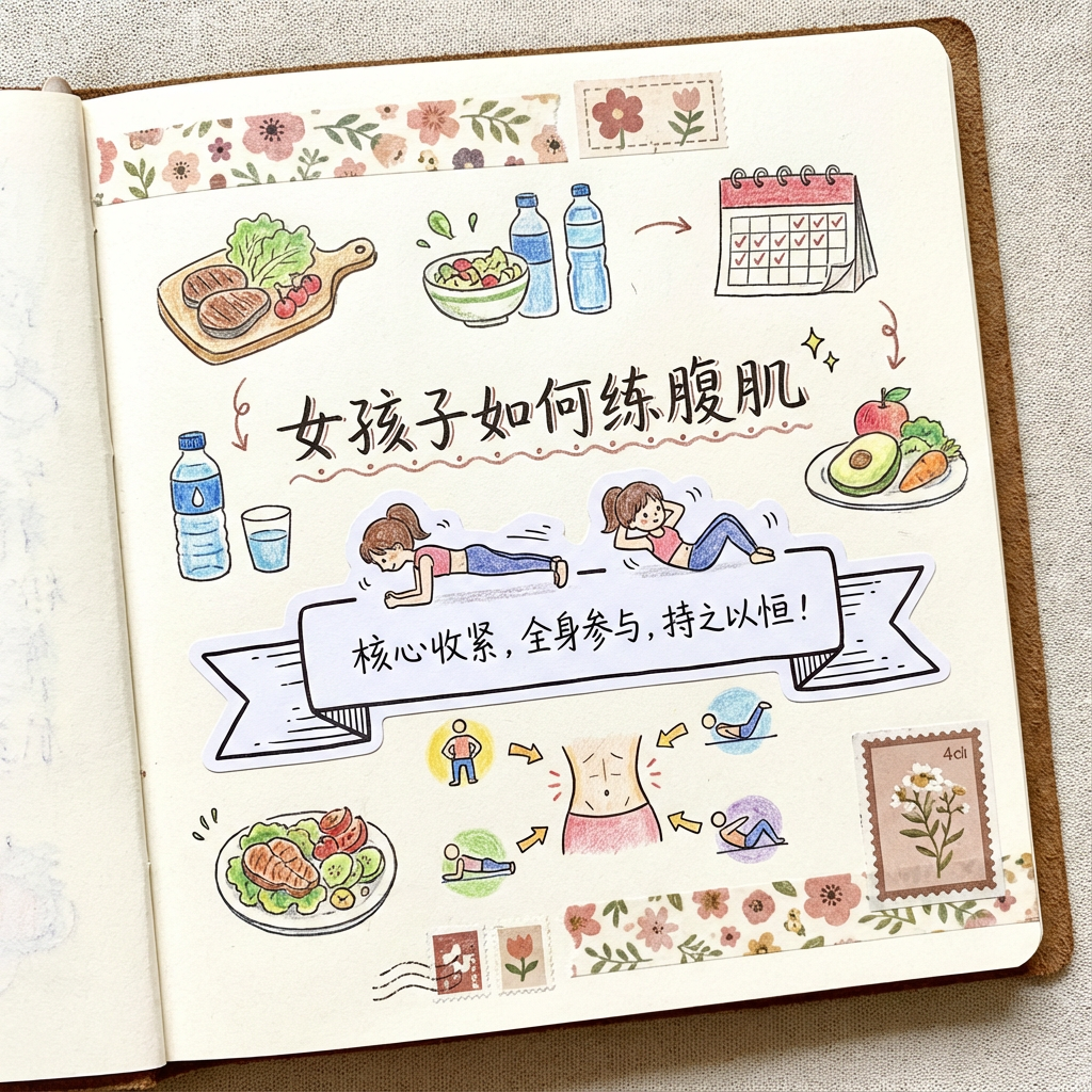 给我用手帐的风格,做一个《女孩子如何练腹肌》的科普 一句话