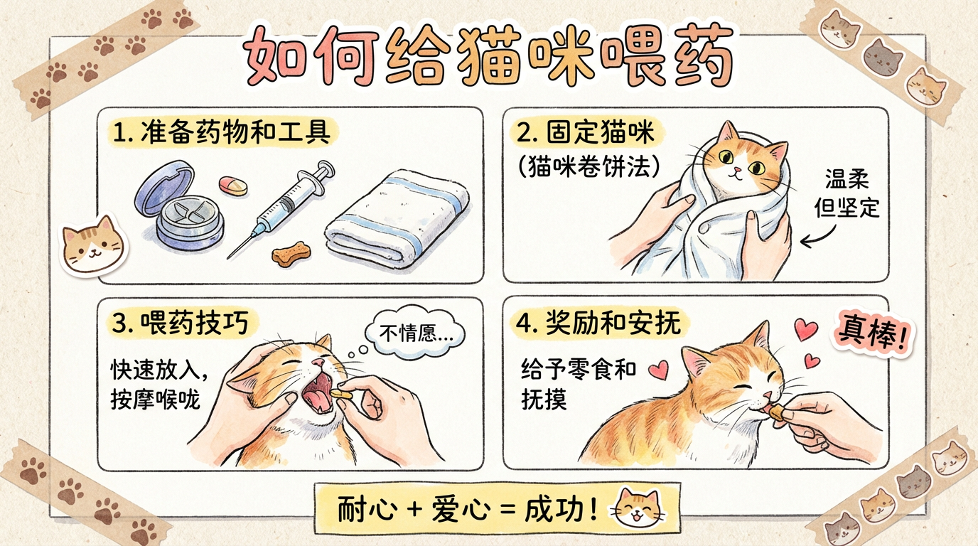 我要手账风格的《如何给猫咪喂药》的插画式信息图,有详细中文文字说明和可爱的猫咪。