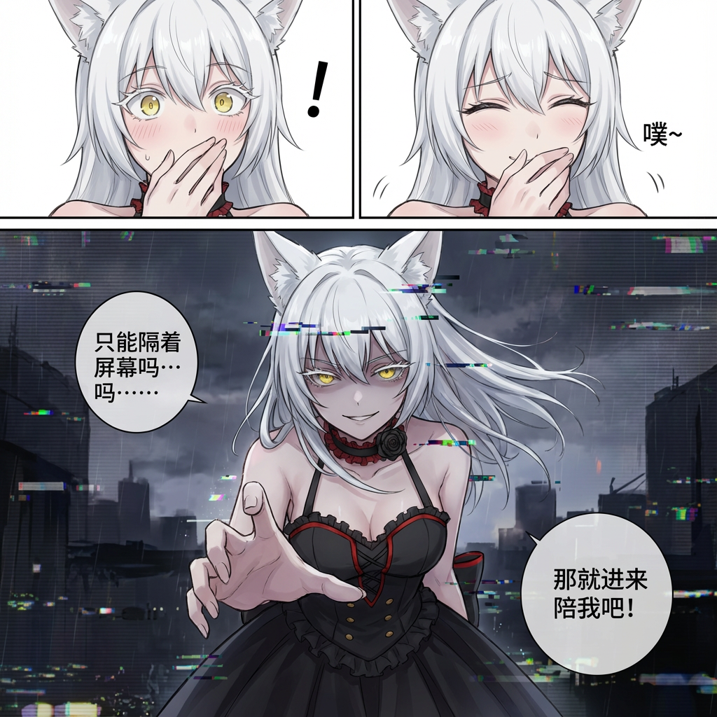 参考图一图二的形象,生成一张类似于图三的三格漫画,画面上方三分之-处的 左半部分是第一格,右半部分是第二格,画面下方占总画面三分之二的位置是第三格。要求人物长相服装与参考图完全一致。第一格为人物的面部特写,眼睛睁大,眼神中带着一丝惊讶,嘴巴被一只手轻轻捂住,旁边配有一个“!的符号,整体神态呈现出意外、略带羞怯的感觉,动作上是单手掩口, 姿态显得较为娇俏。 第二格也是人物的面部特写,眼睛眯起,呈现出笑意,嘴巴微张,那只捂住嘴的手还保持着动作,同时有“噗~的拟声词,神态是开心、俏皮的,仿佛是忍不住要笑出声,动作.上延续了掩口的姿态,却多了几分活泼的情绪。第三格背景是夜晚的街道,画面只出现了人物的上半身,人物画风与参考图一致,画框有一些电子设备被干扰的花纹。人物的发丝被风吹起,眼睛弯弯,面带厌恶和不屑的眼神(和参考图眼神一样),脸颊还有淡淡阴郁。她身体略向前倾,想要用手抓住屏幕外的人,整体神态是阴笑,呈现出一种阴险又病娇的状态。第三格左边有圆形对话框,写着“只能隔着屏幕吗……”。右侧下方有圆形对话框,写着“那就进来陪我吧!”。\n\n视人物服饰细节不同,内容需要轻度修改。比如角色要特别强调一下她的瞳色和白色睫毛,还有根据人设和性格可以调整一下第三格人物的站姿。但总体而言成品就是这种风格的。