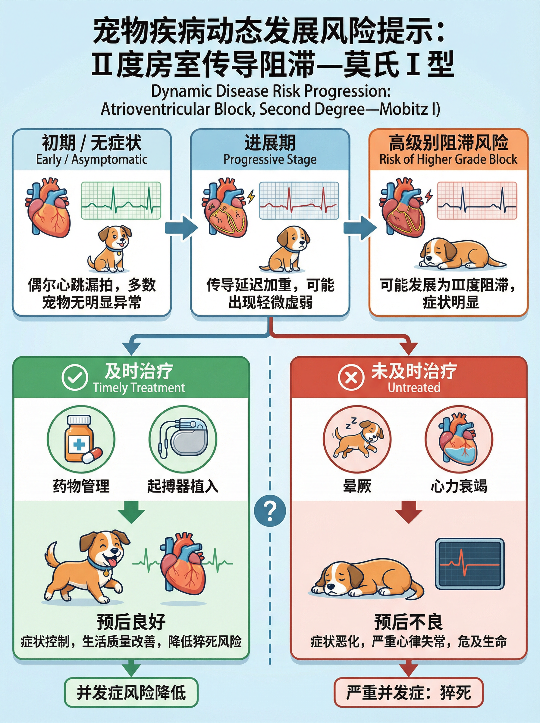 请输出宠物疾病的动态发展风险提示沟通图,宠物疾病名称:Ⅱ度房室传导阻滞——莫氏Ⅰ型(Atrioventricular Block, Second Degree—Mobitz I),请根据此疾病发生发展的趋势过程进行逻辑性讲解,重点表达疾病发生过程中可能的并发症以及治疗与不治疗产生的后果对比,要求浅显易懂,便于医生和宠物家长之间的沟通。有医疗信息图的风格,画面比例是宽3高4。中英文标注(中文在上,英文在下),中文要清晰不能乱码可以反复检查