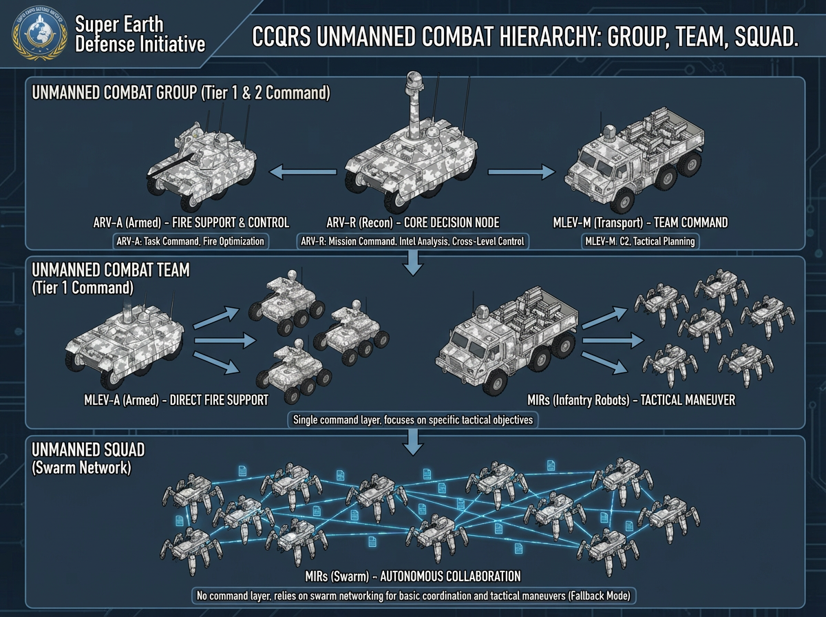 无人战斗群:定义为至少具有2个指挥层级的无人集群,在陆地上,这通常意味着以ARV-R(武装机器人车辆-侦查型)为核心的无人集群。ARV-R作为战斗群的决策核心,向次一级进行战斗队指挥的MLEV(多功能后勤车辆)与ARV-A下发具体的任务指令,后者再将指令下发给其指挥下的战斗队单位,比如MLEV-M运载的MIR(多足*四足*步兵机器人)、或者ARV-A指挥下的MLEV-A(多功能后勤车辆-武装型)。\n无人战斗队:定义为仅有1个指挥层级的最小的指挥性无人集群,例如,由MLEV-M指挥下的6台MIR以及这台MLEV-M(多功能后勤车辆-多足步兵机器人运载型)本身的组合,就是一个无人战斗队。\n\n无人小队:无指挥层级划分、仅具备蜂群组网协同能力的无人集群,例如失去MLEV-M作为指挥与控制单位的情况下,其MIR单位进行蜂群协同作战的情况。\n\n根据搭载平台的不同,CCQRS的无人单位具有不同级别的决策核分析能力,以适应其具体岗位:\n\nMIR:具备接受“指挥与控制”的能力,具备基于自身武器系统和传感器进行OODA循环、完成指定的战术过程的能力,在失去指挥与控制的情况下可通过蜂群组网保持基本的战斗和战术机动能力。\nMLEV:具备接受“指挥与控制”的能力,可以对给定的战术目标进行拆分与规划、对下级单位进行指挥与控制。\nARV-R:具备接受“任务式指挥”的能力,可以对给定的模糊目标进行理解、拆分成具体的战术目标并细化,而后通过指挥与控制的方式下发给各下属单位进行执行(或通过任务式指挥的方式给智能等级相近的无人单位,如ARV-A分发目标),且具备情报分析和实时调整战术目标规划的能力。该单位还具有“越级指挥”功能,其部分冗余信道(如接入上限为16单位的情况下仅指挥8个次级单位、保留可以直接越级控制8个MIR或者SUGV单位的能力)提供了越级控制与同级信息共享(接收来自UAH和RUAV-B信息)的能力。\nARV-A(武装机器人车辆-武装型):具备接受“任务式指挥”的能力,相比于ARV-R,弱化了信息分析、规划调整和任务再分发的能力,对下级单位不具备任务式指挥而仅具备指挥与控制的能力,但另一方面则强化了直射与曲射火力控制与规划实施火力任务的能力,在其干预下可大大优化无人战斗群的火力分配与火力计划。\n\n在ARV-R被毁、没有UAH/其它ARV-R/后方单位通过RUAV-B进行接管的情况下,该无人战斗群会将指挥权限移交ARV-A,同时将部分决策任务下发至MLEV的蜂群网络以降低决策节点压力;如果两台ARV均被毁,该战斗群将在得到接管前以蜂群组网模式继续完成预定战术目标,直到单位完全损失或得到指挥与控制。\n\n一个典型的CCQRS无人战斗群的组成如下:\n1台作为指挥中枢的ARV-R\n1台受ARV-R任务式指挥的ARV-A\n3-4台受ARV-A指挥的MLEV-A\n4-6台受ARV-R指挥的MLEV-M\n24-36台受MLEV-M指挥的MIR\n\n武装机器人车辆(ARV)Armed Robotic Vehicle——6.0吨级6轮全地形车辆,有无人侦察车ARV-R和无人战斗车ARV-A两种变形车,前者可以部署UGSs并作为通信节点,以侦查和监视、对无人战斗群的指挥与控制为主要功能,自卫火力为一挺8.5mm机枪和45mm榴弹发射器;后者装备45mm机关炮和130mm导弹,以作为无人战斗群的火力核心,并对战斗群实施控制与火力优化为主要功能。\r\n多功能后勤与装备车(MLEV)Multifunctional Logistics and Equipment Vehicle——2.0吨级六轮全地形车辆,有运输车(MLEV-M)、工程车(MLEV-E)、小型无人战斗车(MLEV-A)三种同底盘变形车,前二者根据具体任务可以搭载不同模块形成进一步细分的各亚型车(例如用作步兵勤务车辆与用于运载与部署MIR的MLEV-M就是不同亚型),小型无人战斗车通常装备一挺15mm重机枪和4枚90mm火箭弹,重2.5吨。\r\n多足步兵机器人(MIR)Multi-legged Infantry Robot——80-140kg级、以六足形式运动的战斗机器人,用于复杂地形(坑道、山林、城镇废墟)作战,由MLEV运输与部署,单次可携带6台。被激活后从运载车上释放,进行高速高耗能的战术机动。装备安装有1挺8.5mm机枪和1门预装6发杀伤性榴弹的转轮式半自动榴弹发射器的武器站,武器站布置在机器的背部,背负式安装(可由MLEV复装)。\n\n请根据以上内容,以美军项目ppt的风格(但是背景图标和徽标换成“超级地球”的),制作关于“无人战斗群-战斗队-小队”的无人单位集群的介绍海报。各无人载具的具体设定无需在海报中展示,仅用于理解其外形与功能;参考图则分别为ARV-R与ARV-A同框,以及MLEV-A,在绘制MLEV-M和MIR时请参考其风格进行风格统一的绘画。所有文本均以英文呈现。