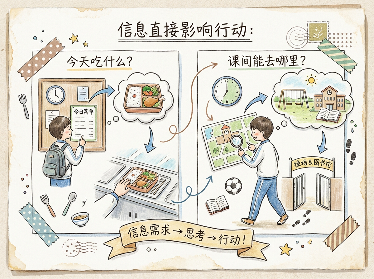2. 信息直接影响行动: 学生阅读是为了知道“今天吃什么?”和“课间能去哪里?”,这是最直接、最原始的信息需求。手帐风 保留标题