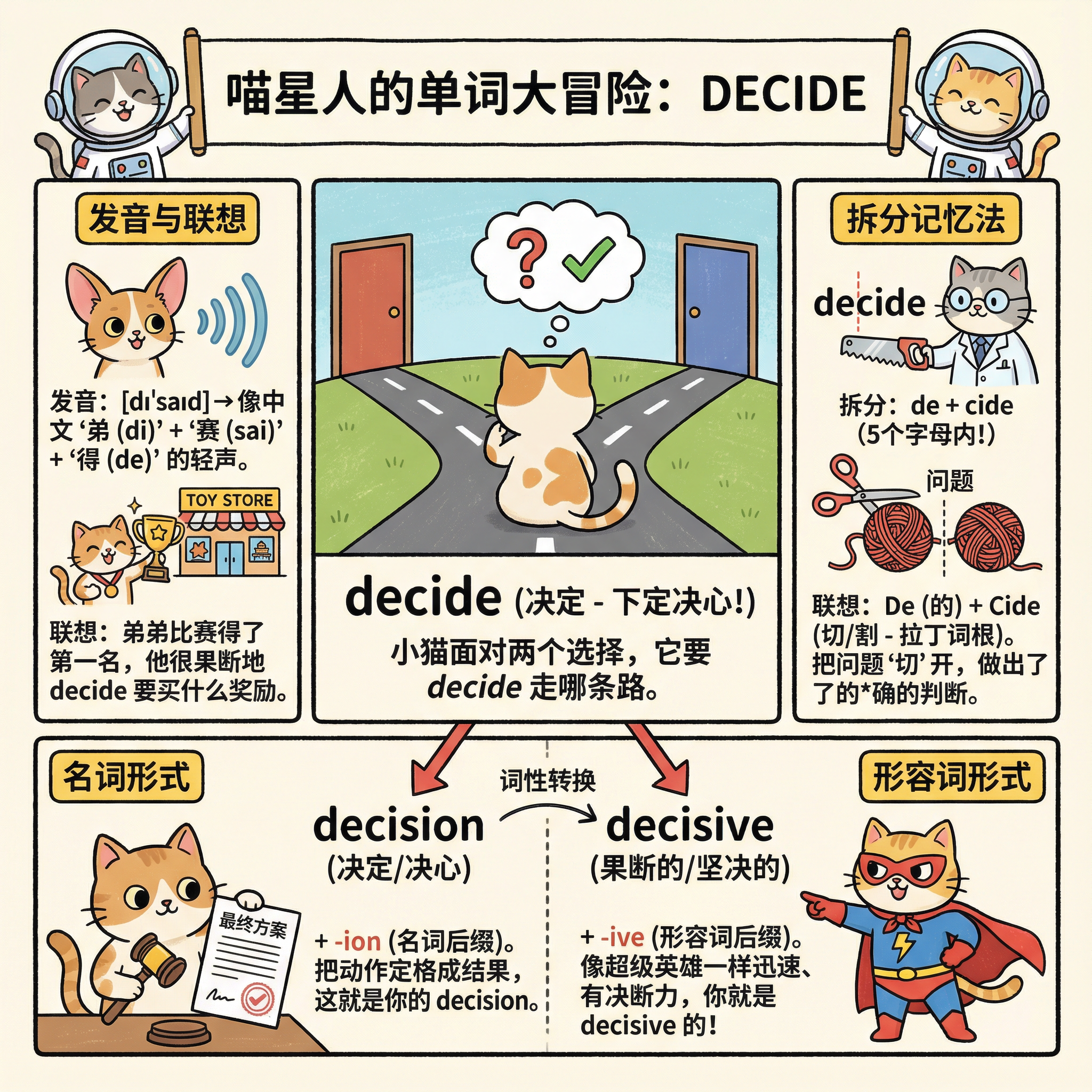 把decide这个词用包含各种可爱猫咪的卡通图文漫画的形式解释并拆解成小学5年级学生容易理解并背诵的形式,图中尽可能使用中文来解释,按照词根,前后缀或者音节的方式来拆分成5个字母以下的部分,还可以用联想的方式加强记忆。同时请把这个单词的发音用中文标注,并用联想的方式帮助记忆。然后再讲解一下词性转换decision和decisive是怎么转的。