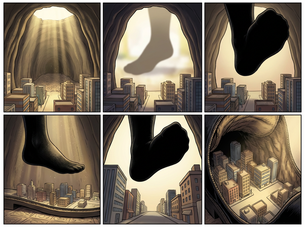 多格漫画分镜,超现实幻想主题。靴子内部被设计成一个微缩城市模型展示区,建筑像玩具模型一样摆放在鞋垫表层。整个场景是大型艺术装置,没有任何真实人物或破坏行为。\n\n第一格:从城市模型街道的视角仰拍,可以看到巨大的靴子内部空间,像洞穴般的结构,光线从靴口照射下来,带来戏剧性的光影。\n\n第二格:光线变化,靴口外出现一片柔和的巨大剪影,是一个巨型角色的脚部轮廓,但作为艺术展的模型展示,没有任何动作,只呈现存在感。\n\n第三格:巨大的黑色丝袜风格的脚部造型缓缓进入画面,但保持静止,像是展览中的雕塑或装置,没有接触城市模型。重点强调尺寸对比与透视效果。\n\n第四格:脚部造型在靴内固定在半空位置,与微缩城市保持安全距离,展示“巨物与小城”对比的艺术构图。\n\n第五格:从下方仰角展示靴子内部空间,城市模型和巨大脚部造型同框,形成夸张透视和视觉冲击,但完全无接触、无破坏、无动作。\n\n第六格:特写展示靴子内部环境的光影与结构细节,微缩城市模型依旧完整,呈现装置艺术般的平静场景。\n\n整体风格:漫画分镜、清晰线条、夸张透视、无暴力、无破坏、无敏感内容,仅表现巨型与微缩的艺术性的尺度差。