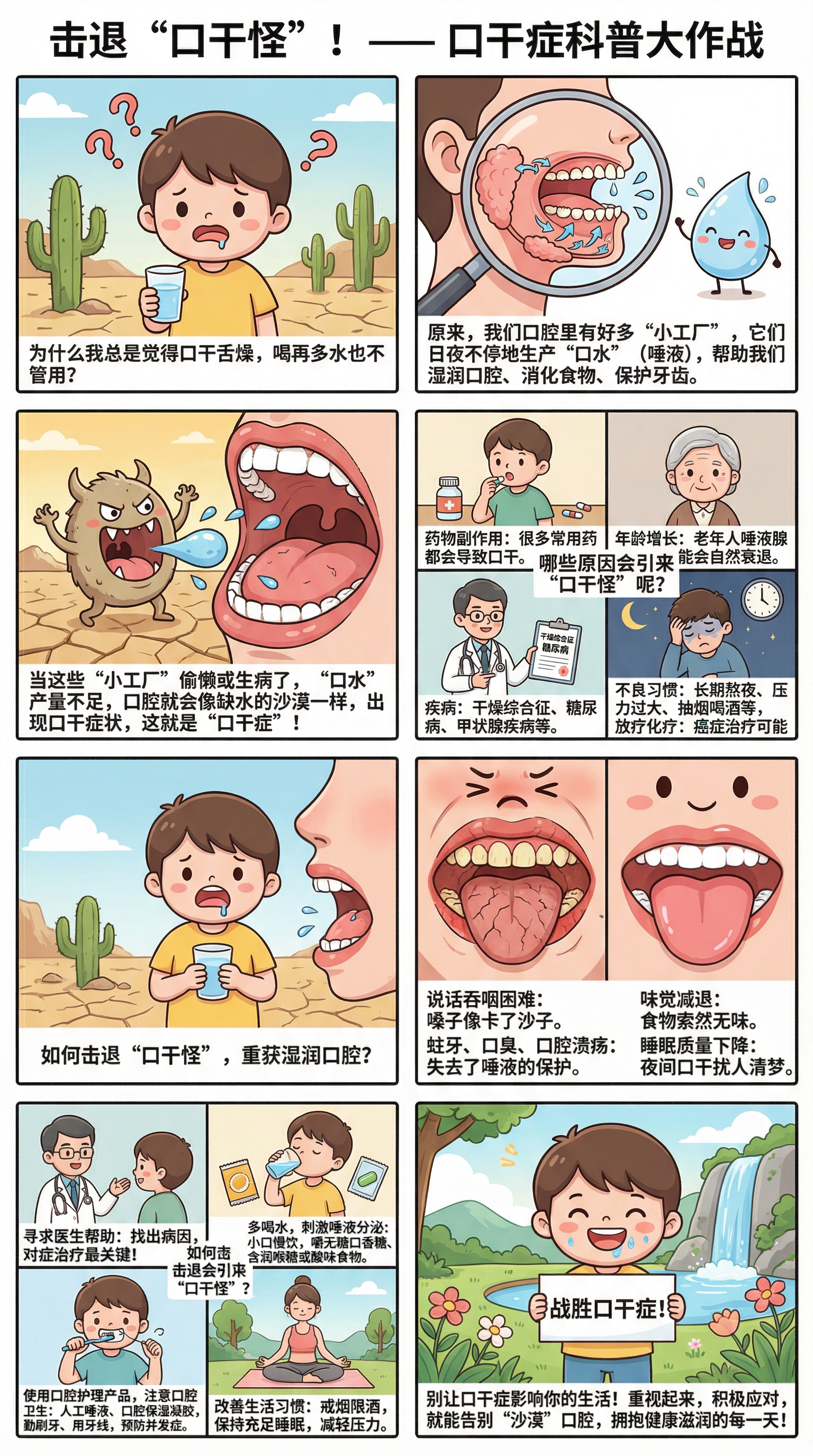 绘制以下漫画:\n标题:击退“口干怪”!—— 口干症科普大作战\n第一格:\n画面: 一个可爱的卡通人物,头上冒着问号,手里拿着一杯水,但表情依然很渴,背景是干燥的沙漠。\n文字: “为什么我总是觉得口干舌燥,喝再多水也不管用?”\n第二格:\n画面: 放大特写口部的解剖图,清晰地展示唾液腺的位置和分泌唾液的过程,旁边有一个小水滴的动画。\n文字: “原来,我们口腔里有好多‘小工厂’,它们日夜不停地生产‘口水’(唾液),帮助我们湿润口腔、消化食物、保护牙齿。”\n第三格:\n画面: 一个卡通“口干怪”出现,张着大嘴,周围是干裂的土地,它正在“吸走”口腔里的水分。\n文字: “当这些‘小工厂’偷懒或生病了,‘口水’产量不足,口腔就会像缺水的沙漠一样,出现口干症状,这就是‘口干症’!”\n第四格:\n画面: 分为几个小图,展示口干症的常见原因:\n小图1: 一个人生病吃药,旁边是药丸。\n小图2: 一个老年人形象。\n小图3: 一个医生拿着报告,上面写着“干燥综合征”、“糖尿病”等字样。\n小图4: 一个熬夜、压力大的年轻人形象。\n文字: “哪些原因会引来‘口干怪’呢?\n药物副作用: 很多常用药都会导致口干。\n年龄增长: 老年人唾液腺功能会自然衰退。\n疾病: 干燥综合征、糖尿病、甲状腺疾病等。\n不良习惯: 长期熬夜、压力过大、抽烟喝酒等。\n放疗化疗: 癌症治疗可能损伤唾液腺。”\n第五格:\n画面: 左右对比图。\n左边: 一个人的口腔内部干裂、舌头粗糙、牙齿发黄,表情痛苦。\n右边: 一个人的口腔湿润、舌头粉嫩、牙齿洁白,表情舒适。\n文字: “‘口干怪’的危害可不小!\n说话吞咽困难: 嗓子像卡了沙子。\n味觉减退: 食物索然无味。\n蛀牙、口臭、口腔溃疡: 失去了唾液的保护。\n睡眠质量下降: 夜间口干扰人清梦。”\n第六格:\n画面: 几个小图,展示击退“口干怪”的方法:\n小图1: 一个医生耐心解释。\n小图2: 一个人喝水,旁边有润喉糖或无糖口香糖。\n小图3: 一个人在进行口腔清洁,牙刷和牙线。\n小图4: 一个人放松地进行瑜伽或冥想。\n文字: “如何击退‘口干怪’,重获湿润口腔?\n寻求医生帮助: 找出病因,对症治疗最关键!\n多喝水: 小口慢饮,保持口腔湿润。\n刺激唾液分泌: 嚼无糖口香糖、含润喉糖或酸味食物。\n使用口腔护理产品: 人工唾液、口腔保湿凝胶等。\n注意口腔卫生: 勤刷牙、用牙线,预防并发症。\n改善生活习惯: 戒烟限酒,保持充足睡眠,减轻压力。”\n第七格:\n画面: 卡通人物露出开心的笑容,口腔湿润,背景是鲜花盛开的绿洲。他举着一个牌子,上面写着“战胜口干症!”\n文字: “别让口干症影响你的生活!重视起来,积极应对,就能告别‘沙漠’口腔,拥抱健康滋润的每一天!”