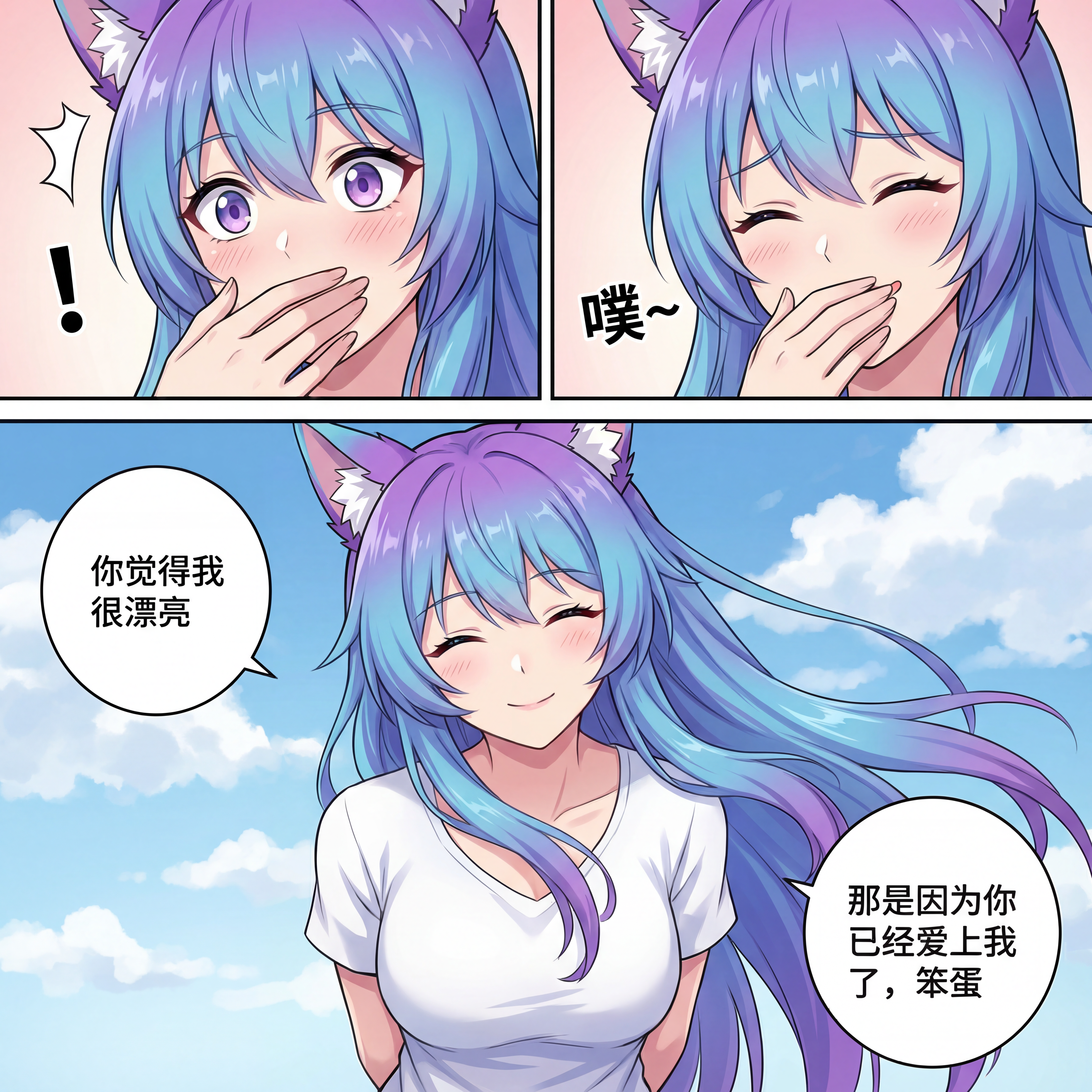 生成一张三格漫画,画面上方三分之一处的左半部分是第一格,右半部分是第二格,画面下方占总画面三分之二的位置是第三格。要求人物长相服装与参考图完全一致。第一格为人物的面部特写,眼睛睁大,眼神中带着一丝惊讶,嘴巴被一只手轻轻捂住,旁边配有一个 “!” 的符号,整体神态呈现出意外、略带羞怯的感觉,动作上是单手掩口,姿态显得较为娇俏。第二格也是人物的面部特写,眼睛眯起,呈现出笑意,嘴巴微张,那只捂住嘴的手还保持着动作,同时有 “噗~” 的拟声词,神态是开心、俏皮的,仿佛是忍不住要笑出声,动作上延续了掩口的姿态,却多了几分活泼的情绪。第三格背景是有云朵的天空,画面只出现了人物的上半身,人物画风与参考图完全一致。人物的发丝被风吹起,眼睛弯弯,面带柔和的笑容,脸颊还有淡淡的红晕。她姿态放松,身体略向前倾,双手背在身后,整体神态是自信且温柔,呈现出一种大方又迷人的状态。第三格左边有圆形对话框,写着“你觉得我很漂亮”。右侧下方有圆形对话框,写着“那是因为你已经爱上我了,笨蛋”。