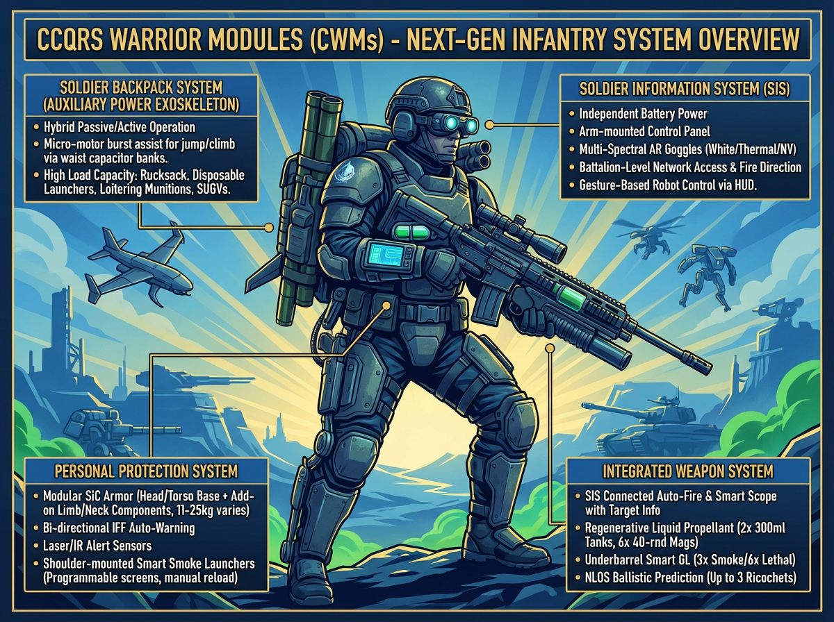 CCQRS战士组件(CWMs):(CCQRS Warrior Modules)\r\n单兵背负系统——辅助动力外骨骼,在大部分情况下以无动力外骨骼的形式发挥作用,通过从单兵信息系统的电池充电的腰部电容组允许关节处的微型电机进行爆发出力以辅助跳跃或攀爬;该系统主要承载个人防护装备和背负附加设备,后者例如行军背囊、次抛火箭筒、巡飞弹、SUGVs等。\r\n单兵信息系统——以单兵背负系统的承载力为基础,独立携带电池,涵盖手臂内侧的操作面板、增强现实护目镜(白光、热成像、夜视三通道),个人信息终端、多频谱联网收发器,将单兵接入CCQRS系统的信息网,具备不低于营级的信息共享和火力指示能力,可通过目镜获取遥控机器人的信息,并通过手势而无需专用设备控制机器人。\r\n个人防护系统——基础覆盖头、胸、腹的碳化硅防弹插板组件和防弹头盔,可增加的颈部、手臂和腿部保型防弹组件(需要安装于单兵背负系统上,根据四肢防护的取舍。防护装备重量在11-25kg之间浮动),IFF自动收发器(在被友军火控照射时会自动双向告警),激光、红外告警器,肩部智能烟雾发射器(可以根据预设的模式和士兵的指令生成对应距离和形状的烟幕屏障,可手动复装)。\r\n综合武器系统——接入单兵信息系统,可在瞄准线与标定目标重合时自动开火,瞄准镜可提供目标基础信息;采用再生式液体火药发射射弹,标准弹药配置为2个300ml液体火药罐和6个40发弹匣;自带下挂式榴弹发射器(配备3发进攻性烟雾弹和6发智能杀伤榴弹)、通过单兵信息系统提供弹道预测和非视距落点预估,允许计算至多不超过3次的反弹轨迹。\n\n根据以上对CWMs系统的描述,请以写实向的平面绘画风格绘制CWMs士兵的宣传和介绍海报,整体风格可以是蓝色基调加上金黄和绿色的“超级地球”风格的海报,介绍内容则是美军项目PPT的风格,海报上的文字采用英语