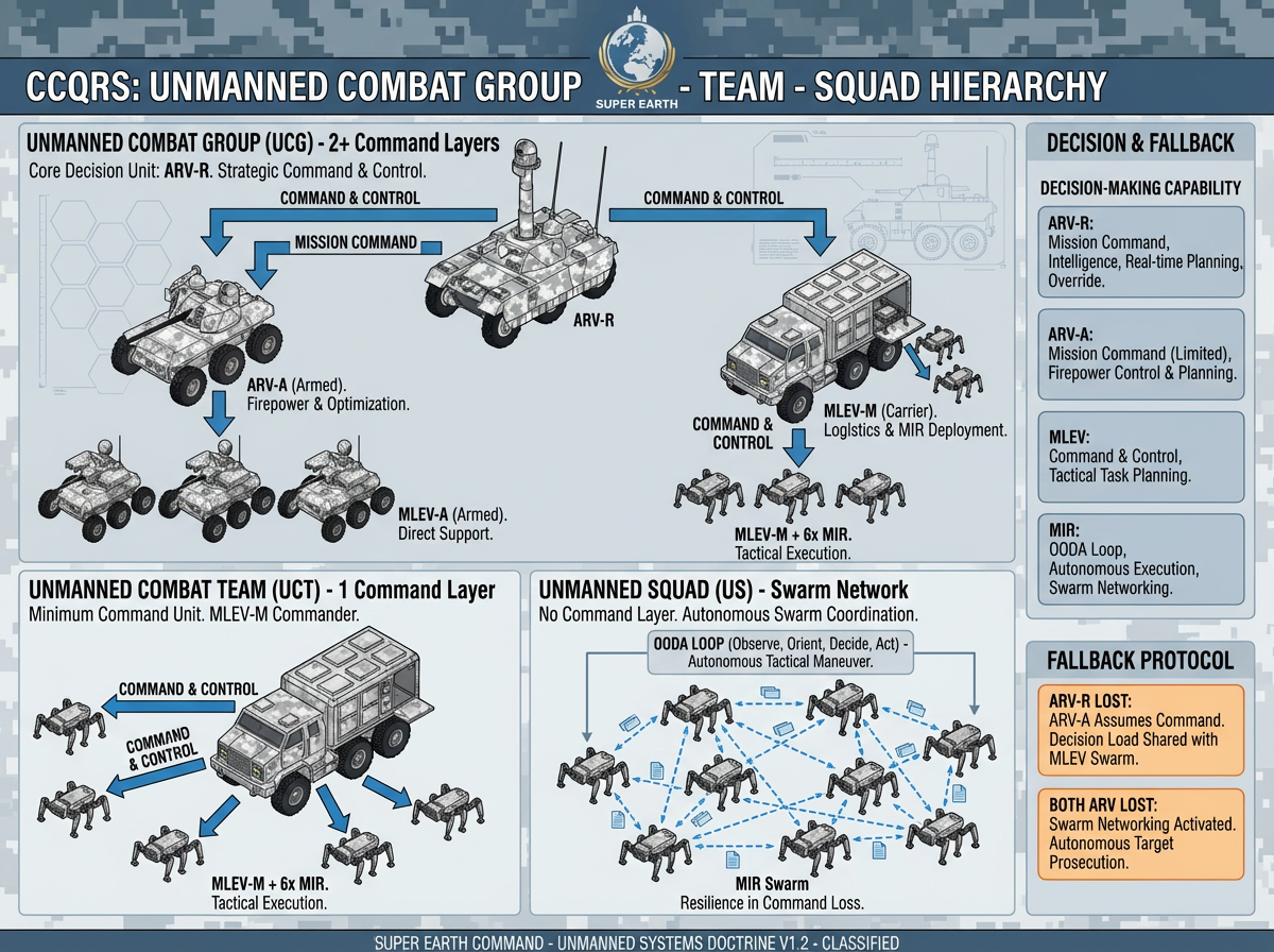 无人战斗群:定义为至少具有2个指挥层级的无人集群,在陆地上,这通常意味着以ARV-R(武装机器人车辆-侦查型)为核心的无人集群。ARV-R作为战斗群的决策核心,向次一级进行战斗队指挥的MLEV(多功能后勤车辆)与ARV-A下发具体的任务指令,后者再将指令下发给其指挥下的战斗队单位,比如MLEV-M运载的MIR(多足*四足*步兵机器人)、或者ARV-A指挥下的MLEV-A(多功能后勤车辆-武装型)。\n无人战斗队:定义为仅有1个指挥层级的最小的指挥性无人集群,例如,由MLEV-M指挥下的6台MIR以及这台MLEV-M(多功能后勤车辆-多足步兵机器人运载型)本身的组合,就是一个无人战斗队。\n\n无人小队:无指挥层级划分、仅具备蜂群组网协同能力的无人集群,例如失去MLEV-M作为指挥与控制单位的情况下,其MIR单位进行蜂群协同作战的情况。\n\n根据搭载平台的不同,CCQRS的无人单位具有不同级别的决策核分析能力,以适应其具体岗位:\n\nMIR:具备接受“指挥与控制”的能力,具备基于自身武器系统和传感器进行OODA循环、完成指定的战术过程的能力,在失去指挥与控制的情况下可通过蜂群组网保持基本的战斗和战术机动能力。\nMLEV:具备接受“指挥与控制”的能力,可以对给定的战术目标进行拆分与规划、对下级单位进行指挥与控制。\nARV-R:具备接受“任务式指挥”的能力,可以对给定的模糊目标进行理解、拆分成具体的战术目标并细化,而后通过指挥与控制的方式下发给各下属单位进行执行(或通过任务式指挥的方式给智能等级相近的无人单位,如ARV-A分发目标),且具备情报分析和实时调整战术目标规划的能力。该单位还具有“越级指挥”功能,其部分冗余信道(如接入上限为16单位的情况下仅指挥8个次级单位、保留可以直接越级控制8个MIR或者SUGV单位的能力)提供了越级控制与同级信息共享(接收来自UAH和RUAV-B信息)的能力。\nARV-A(武装机器人车辆-武装型):具备接受“任务式指挥”的能力,相比于ARV-R,弱化了信息分析、规划调整和任务再分发的能力,对下级单位不具备任务式指挥而仅具备指挥与控制的能力,但另一方面则强化了直射与曲射火力控制与规划实施火力任务的能力,在其干预下可大大优化无人战斗群的火力分配与火力计划。\n\n在ARV-R被毁、没有UAH/其它ARV-R/后方单位通过RUAV-B进行接管的情况下,该无人战斗群会将指挥权限移交ARV-A,同时将部分决策任务下发至MLEV的蜂群网络以降低决策节点压力;如果两台ARV均被毁,该战斗群将在得到接管前以蜂群组网模式继续完成预定战术目标,直到单位完全损失或得到指挥与控制。\n\n一个典型的CCQRS无人战斗群的组成如下:\n1台作为指挥中枢的ARV-R\n1台受ARV-R任务式指挥的ARV-A\n3-4台受ARV-A指挥的MLEV-A\n4-6台受ARV-R指挥的MLEV-M\n24-36台受MLEV-M指挥的MIR\n\n武装机器人车辆(ARV)Armed Robotic Vehicle——6.0吨级6轮全地形车辆,有无人侦察车ARV-R和无人战斗车ARV-A两种变形车,前者可以部署UGSs并作为通信节点,以侦查和监视、对无人战斗群的指挥与控制为主要功能,自卫火力为一挺8.5mm机枪和45mm榴弹发射器;后者装备45mm机关炮和130mm导弹,以作为无人战斗群的火力核心,并对战斗群实施控制与火力优化为主要功能。\r\n多功能后勤与装备车(MLEV)Multifunctional Logistics and Equipment Vehicle——2.0吨级六轮全地形车辆,有运输车(MLEV-M)、工程车(MLEV-E)、小型无人战斗车(MLEV-A)三种同底盘变形车,前二者根据具体任务可以搭载不同模块形成进一步细分的各亚型车(例如用作步兵勤务车辆与用于运载与部署MIR的MLEV-M就是不同亚型),小型无人战斗车通常装备一挺15mm重机枪和4枚90mm火箭弹,重2.5吨。\r\n多足步兵机器人(MIR)Multi-legged Infantry Robot——80-140kg级、以四足或六足形式运动的战斗机器人,用于复杂地形(坑道、山林、城镇废墟)作战,由MLEV运输与部署,单次可携带6台。被激活后从运载车上释放,进行高速高耗能的战术机动。装备1挺8.5mm机枪和1门预装6发杀伤性榴弹的转轮式半自动榴弹发射器(可由MLEV复装)。\n\n请根据以上内容,以美军项目ppt的风格(但是背景图标和徽标换成“超级地球”的),制作关于“无人战斗群-战斗队-小队”的无人单位集群的介绍海报。各无人载具的具体设定无需在海报中展示,仅用于理解其外形与功能;参考图则分别为ARV-R与ARV-A同框,以及MLEV-A,在绘制MLEV-M和MIR时请参考其风格进行风格统一的绘画。所有文本均以英文呈现。