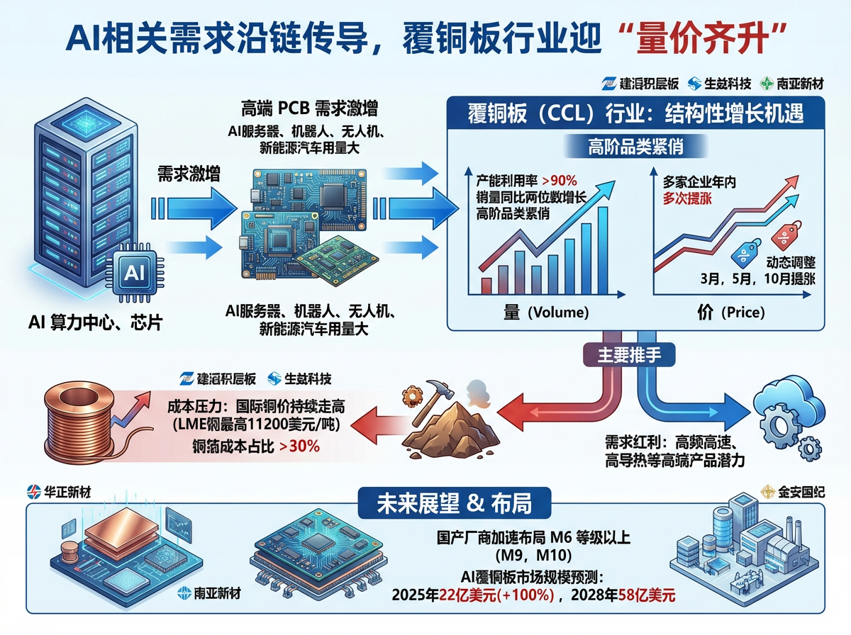 AI算力革命驱动高端印刷电路板(PCB)需求激增,其上游关键基础材料覆铜板(CCL)也迎来结构性增长机遇,部分高阶品类成为紧俏货。\n\n国内某覆铜板厂人士表示,“上半年的需求是回升了,但说供不应求,那要分产品。有部分产品确实需求很旺盛,有一部分产品还是平稳增长。”\n\n财联社记者近日多方采访获悉,多家覆铜板企业年内已多次提涨产品价格,目前仍在持续进行动态调整,成本压力、需求红利成为涨价的重要推手。因看好高频高速、高导热等高端产品未来增长潜力,国产厂商亦加速相关产能布局。\n\n据了解,覆铜板是PCB成本结构中的“重头戏”,而铜箔作为覆铜板的主要制作原材料,成本占比高达30%以上,铜价的上涨直接影响了覆铜板的生产成本。\n\n今年以来国际铜价持续走高,截至今年10月底,LME铜最高触及11200美元/吨。\n\n对于铜价高企的主因,卓创资讯分析师唐志浩在接受财联社记者采访时提到,AI算力中心、芯片用铜箔、电网升级等拉动铜消费,中国新能源、电力板块维持高景气,对冲地产下行拖累,库存低位放大价格弹性。\n\n“后市来看,矿山品位下滑、深部开采导致维持性CAPEX不断攀升,2025-2030年矿产量年均增速预计仅1.5%左右,远低于需求增速,供应短缺预期将给予铜价硬支撑。”唐志浩认为,短中期LME铜核心运行区间10000-11000美元/吨,中长期若矿端投资仍滞后且绿色需求超预期,均价有望逐级上移至10750-11200美元/吨。\n\n在消费端,部分用铜企业实施套期保值操作应对铜价上涨。有的更为直接,通过调涨板料价格来实现成本传导。仅从今年上半年来看,因“铜价格大幅上涨”,头部大厂建滔积层板(01888.HK)分别在3月、5月发出涨价函,此举引发行业内其他厂商跟涨。\n\n涨价不仅源于成本推动,需求端的结构性增长同样助推覆铜板产品价格提涨。\n\n“PCB属于成熟制造业,其根据下游的需求不断在更新,市场变化快,需求快,作为材料商也要随着变化。”当前AI技术深度应用以及新兴产业快速发展带来新增量,一位从业者向财联社记者表示,“AI算力、机器人、无人机、新能源汽车等的电控系统需要用到覆铜板、电路板且用量相对较大。”\n\n财联社记者近日以投资者身份致电覆铜板上市公司。南亚新材(688519.SH)证券部工作人员表示,目前产能利用率在90%以上。(价格)已经在涨,对于涨价节点,其透露“10月份涨过”。此外,今年上半年也有过价格提涨。\n\n华正新材(603186.SH)工作人员也表示,目前产能利用率在高位,跟上半年以及去年对比都是有所上升。提及涨价,其称“我们有在做相应调整。10月份就已经有在调,分产品分客户去动态的调整”。\n\n对于会否因铜价高而调升产品价格,该工作人员表示,要综合考虑原材料涨价的幅度、持续性等。\n\n金安国纪(002636.SZ)工作人员表示,价格方面公司是随行就市,价格与需求相辅相成。市场需求旺盛,上游的价格才能涨起来。此外,有行业厂商表示,目前仍分批对不同覆铜板产品价格进行调整。\n\n国内某覆铜板厂人士告诉财联社记者,整个市场的需求在增加,公司2023年和2024年的销量同比保持两位数增长,销量增加,但盈利不佳,扣非净利润仍亏损,原因是前期价格比较低。国内竞争较激烈,下游也有自己的成本要求,意味着上游的材料不能太贵,导致覆铜板价格没办法很坚挺。该人士坦称,覆铜板产品价格从2022年开始下跌,一直跌到去年,目前虽在回升但远未恢复到2021年的水平。\n\n不过市场行情的进一步好转以及前期涨价带来的效益已显著提振厂商业绩。今年前三季度,生益科技(600183.SH)、金安国纪、超声电子(000823.SZ)等行业公司实现营收净利双增长,净利润同比增幅在20%-78%不等。针对业绩变动,金安国纪在三季报中指出主要系主营产品毛利增加。\n\n随着AI服务器等应用场景对高阶覆铜板的需求攀升,国产厂商也加速布局M6等级以上产品技术。比如,生益科技极低损耗产品已批量供应;超颖电子(603175.SH)在互动平台透露,公司已与数家客户密切配合M9覆铜板技术。\n\n南亚新材总经理包欣洋近日在业绩会上表示,在高速材料领域,公司已前瞻性地启动了M10等级覆铜板产品的研发布局。下一代产品的技术攻关将聚焦于实现更低的介电损耗以进一步提升信号传输质量、更低的热膨胀系数(CTE) 以增强封装互连的可靠性,以及更高的耐热性能以满足日益增长的散热需求。对于M10等级覆铜板产品的进展,公司证券部工作人员称,“实验室产品已经出来了”。\n\n兴业研究认为,AI覆铜板成为推动行业新一轮增长的引擎,据测算2025年AI覆铜板市场(AI服务器、交换机、光模块)规模为22亿美元,同比增长100%,预计2026年因ASIC放量和英伟达新产品覆铜板升级为M9,AI覆铜板市场将达到34亿美元,同比增长60%,至2028年则有望达到58亿美元,2024-2028年AI 覆铜板复合增长率为52%。 请根据以上文字,提取出关键信息与数据,用一张图体现出当下PCB最新趋势,标题为“AI相关需求沿链传导,覆铜板行业迎“量价齐升”