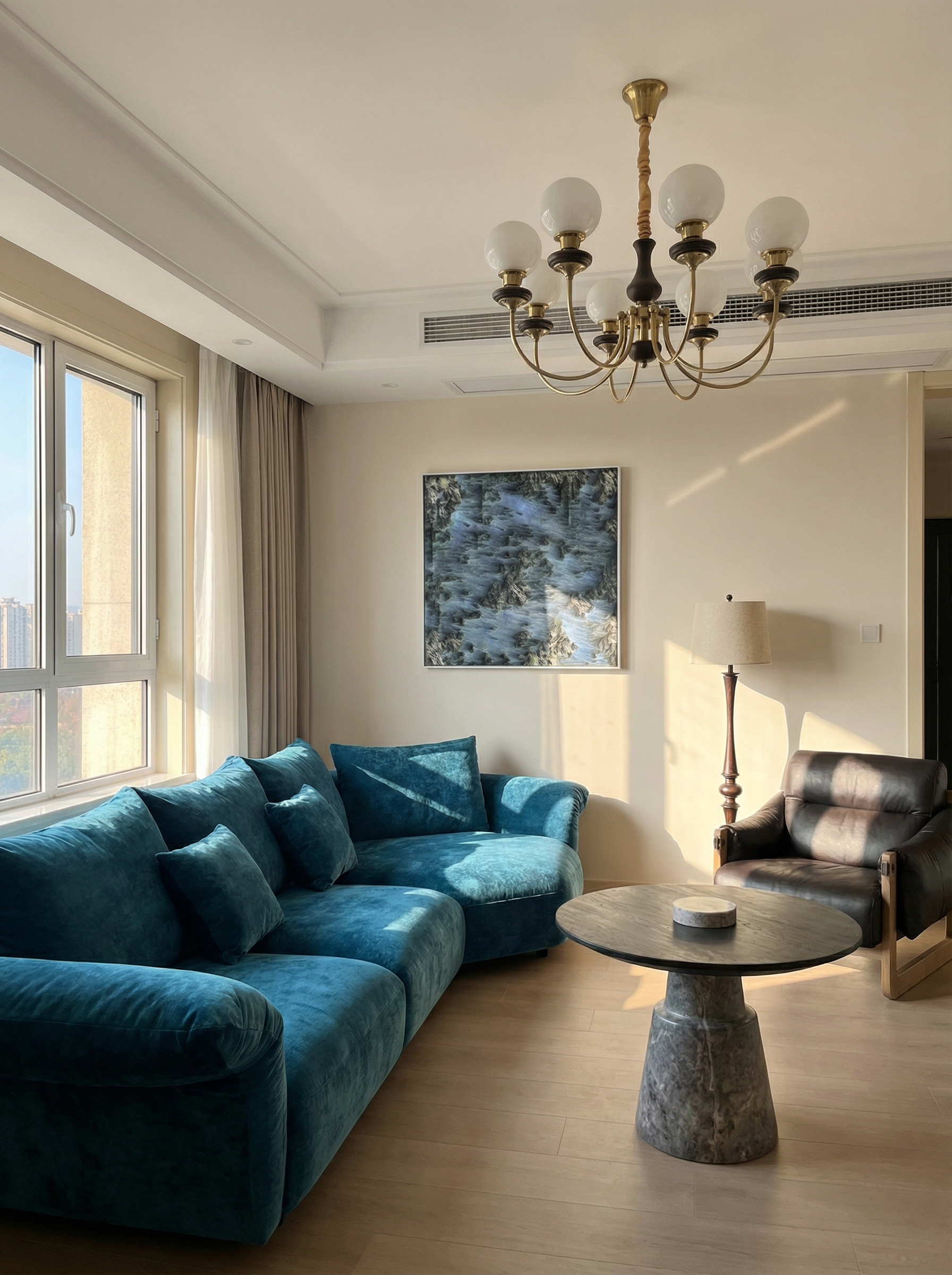 将这些图像合成一个3:4格式的适当排列室内设计装修图像,白天室内客厅场景,有阳光。 | Visualize