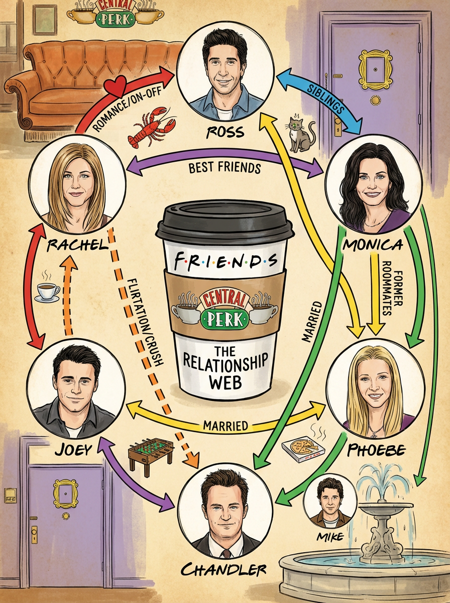 画一张信息图,表现美剧《六人行》中6位主人公的关系。使用剧中的美术元素、风格和人物形象。 | Visualize