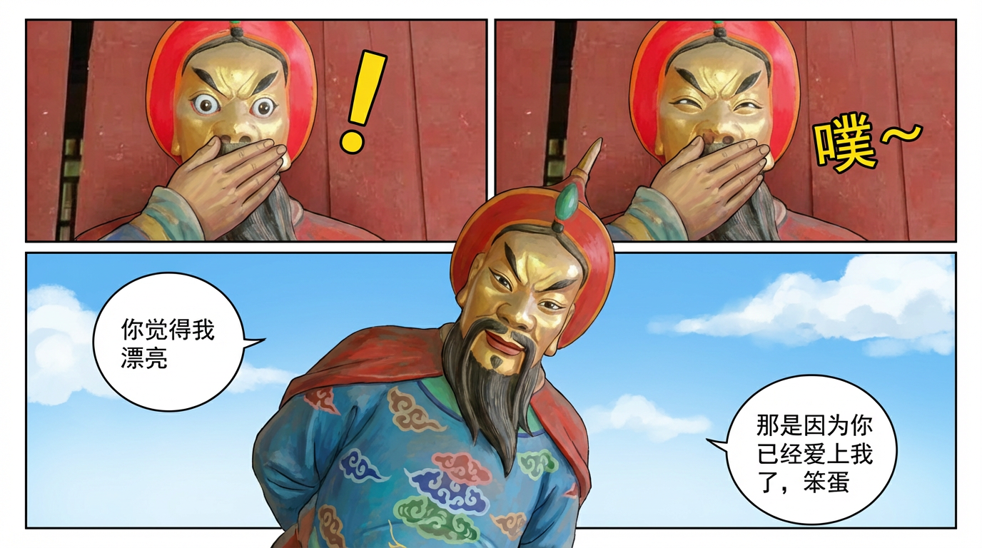注意维持原图的人物特征和衣着,不要改变原图的绘画风格。\n生成一张三格漫画,画面上方三分之一处的左半部分是第一格,右半部分是第二格,画面下方占总画面三分之二的位置是第三格。要求人物长相服装与参考图完全一致。第一格为人物的面部特写,眼睛睁大,眼神中带着一丝惊讶,嘴巴被一只手轻轻捂住,旁边配有一个 “!” 的符号,整体神态呈现出意外、略带羞怯的感觉,动作上是单手掩口,姿态显得较为娇俏。第二格也是人物的面部特写,眼睛眯起,呈现出笑意,嘴巴微张,那只捂住嘴的手还保持着动作,同时有 “噗~” 的拟声词,神态是开心、俏皮的,仿佛是忍不住要笑出声,动作上延续了掩口的姿态,却多了几分活泼的情绪。第三格背景是有云朵的天空,画面只出现了人物的上半身,人物画风与参考图完全一致。人物姿态放松,身体略向前倾,双手背在身后,整体神态是自信且温柔,呈现出一种大方又迷人的状态。第三格左边有圆形对话框,写着“你觉得我漂亮”。右侧下方有圆形对话框,写着“那是因为你已经爱上我了,笨蛋”。