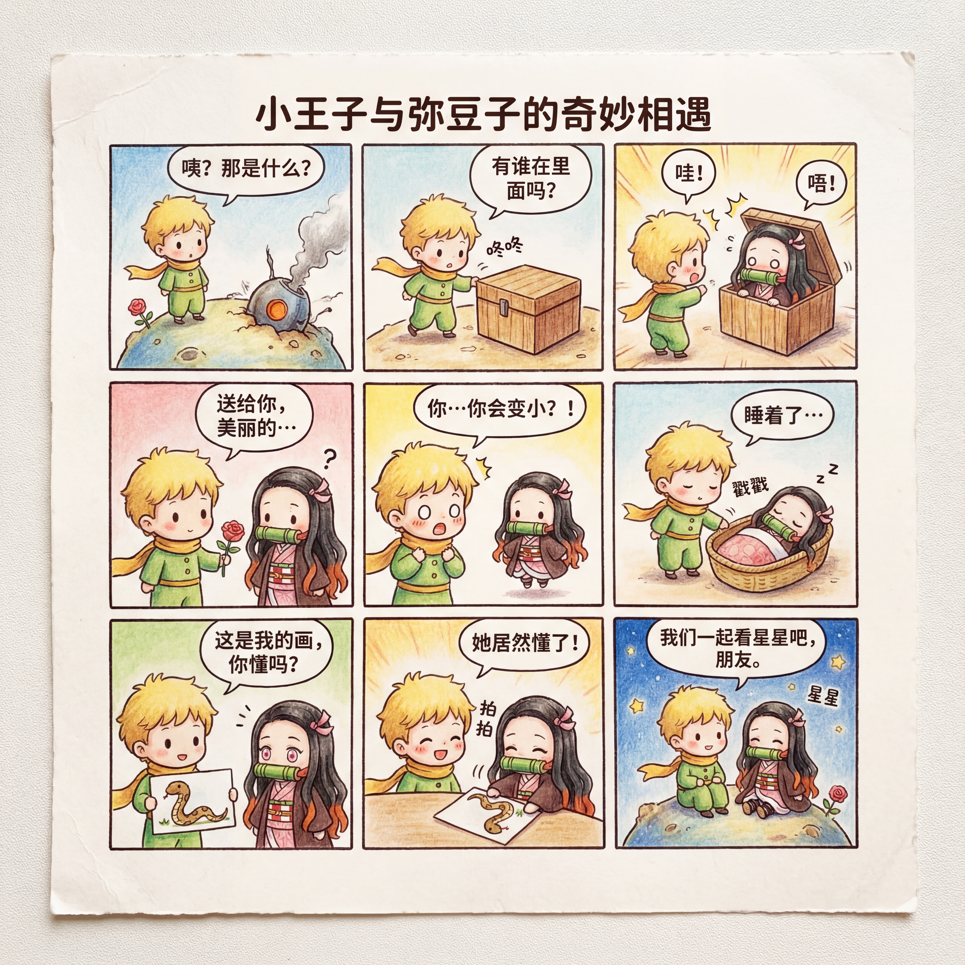 小王子和弥豆子的Q版九格漫画,趣味十足,彩色,中文。