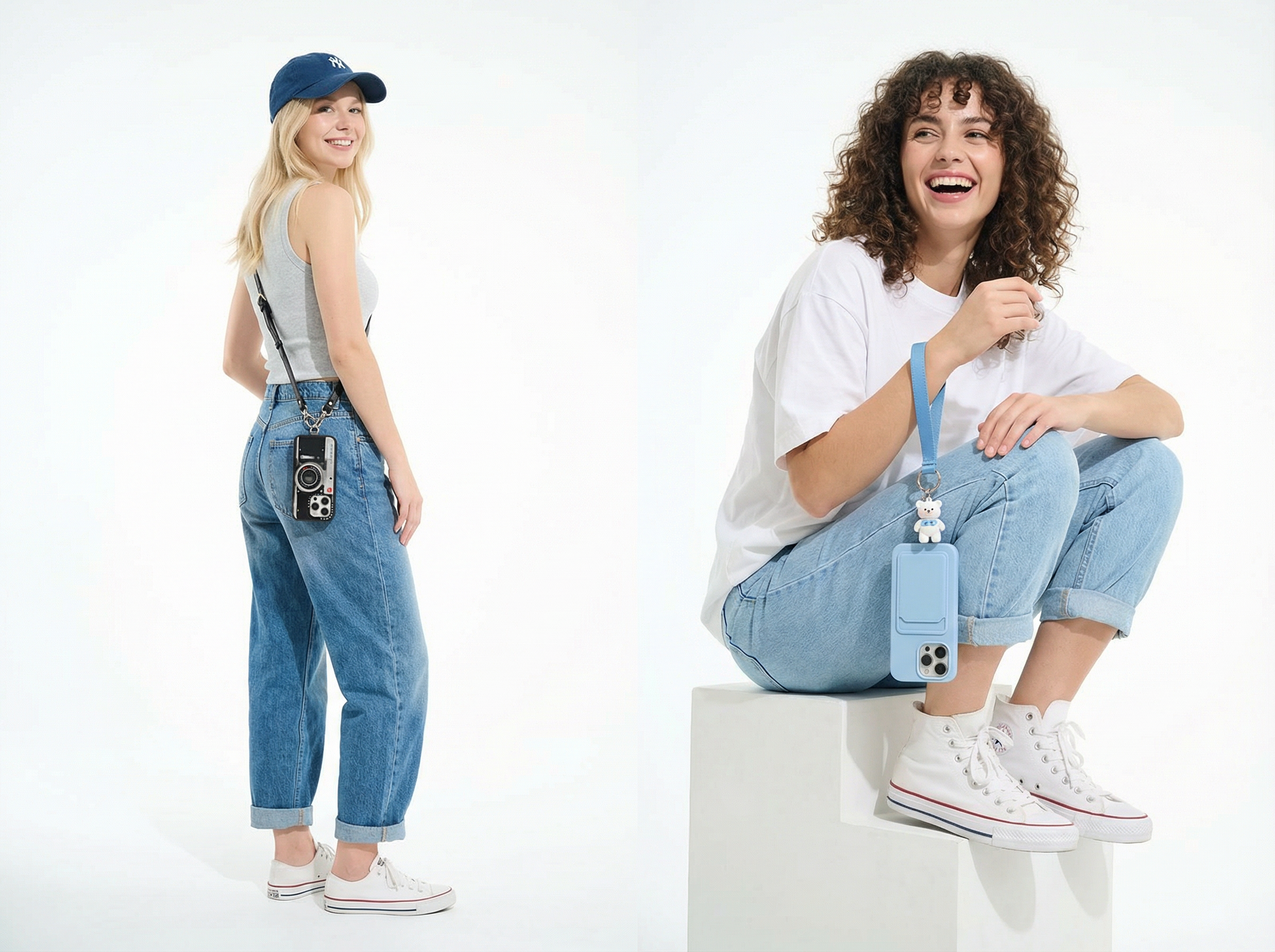 整体风格:保持第一张参考照片的休闲时尚氛围,但模特改为欧美女性(例如,20-30岁、金发或棕发、苗条身材,穿着宽松牛仔裤和白色T恤,体现欧美街头潮流)。背景为白色简约工作室,强调手机壳的细节。\n姿势与布局:类似原参考照片的双人并排构图,左边模特背式携带,右边模特手挂式展示。每个模特手持iPhone 13/14系列手机,突出替换后的手机壳。\n左边模特(替换红色手机壳为参考图左边黑色挂绳手机壳)\n模特描述:欧美白人女性,短金发,戴蓝色棒球帽,微笑自信。身穿浅灰色无袖上衣和宽松蓝色牛仔裤,脚踩白色帆布鞋。姿势:侧身站立,左手自然下垂,右手轻触帽子。\n手机壳细节(替换为参考图左边黑色挂绳手机壳):\n黑色挂绳设计,手机壳为透明或半透明材质,兼容iPhone,带有小型相机挂饰(黑色Leica风格相机模型)。\n挂绳为细黑皮革,长度约30cm,从肩部跨背携带,像斜挎包。\n手机壳上有简单金属扣和钥匙链元素,强调实用性和街头感。\n视觉效果:模特背着手机壳,挂绳从右肩垂到左腰,手机自然贴合身体曲线。牛仔裤边缘微微卷起,突出休闲欧美风。\n右边模特(替换粉色手机壳为参考图右边浅蓝色挂绳手机壳)\n模特描述:欧美棕发女性,中长卷发,开心大笑。身穿白色宽松T恤和浅蓝色牛仔裤,脚踩白色高帮运动鞋。姿势:半蹲坐在白色立方体凳子上,双腿伸展,右手握住手机壳。\n手机壳细节(替换为参考图右边浅蓝色挂绳手机壳):\n浅蓝色挂绳设计,手机壳为硅胶或硬壳材质,带有可爱卡通挂饰(例如,白色小熊或字母链)。\n挂绳为蓝色织物,长度约20cm,手挂在右手腕上,手机壳正面有iPhone兼容的卡扣。\n强调可爱与功能性,挂饰在牛仔裤上轻轻晃动。\n视觉效果:模特手挂手机壳,腿部伸直展示鞋子细节,牛仔裤宽松卷边,营造轻松的欧美日常look。\n额外建议\n照明与构图:自然光照,左模特稍暗以突出背式,右模特亮光强调手挂。整体分辨率高,适合电商展示。