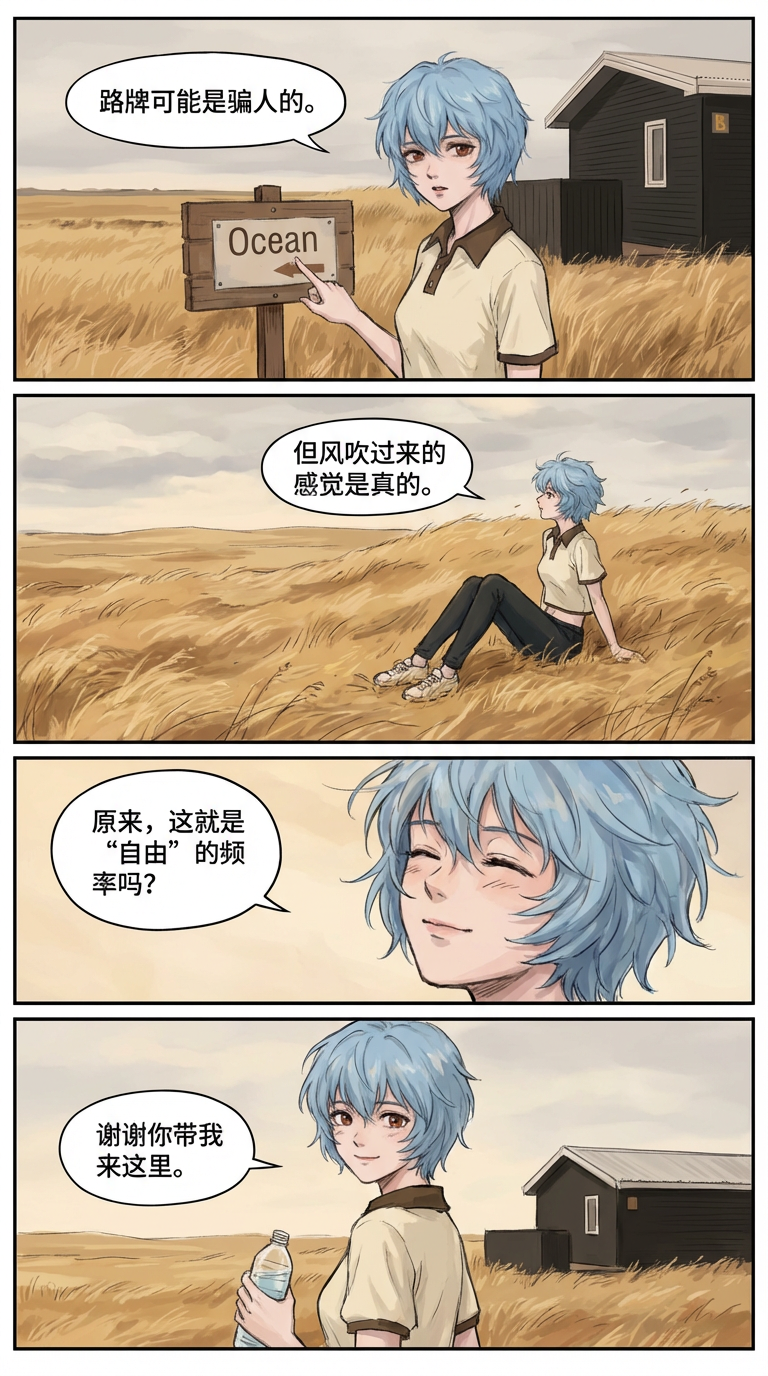生成一张竖屏的四格漫画\n\n【分镜内容】:\n第一格:\n画面:少女站在麦田边,手指着一个写着英文“Ocean”的木质路牌,看向镜头。\n对话气泡文字:“路牌可能是骗人的。”\n\n第二格:\n画面:少女坐在金黄色的枯草地上,望着远处的地平线,背景是像海浪一样的麦田。\n对话气泡文字:“但风吹过来的感觉是真的。”\n\n第三格:\n画面:少女的面部特写,她闭着眼睛,一脸享受地听着风声,头发被风吹得有些凌乱。\n对话气泡文字:“原来,这就是‘自由’的频率吗?”\n\n第四格:\n画面:少女手里拿着矿泉水瓶,侧身回头对着镜头温柔地微笑,背景远处有一栋黑色的北欧小木屋。\n对话气泡文字:“谢谢你带我来这里。”