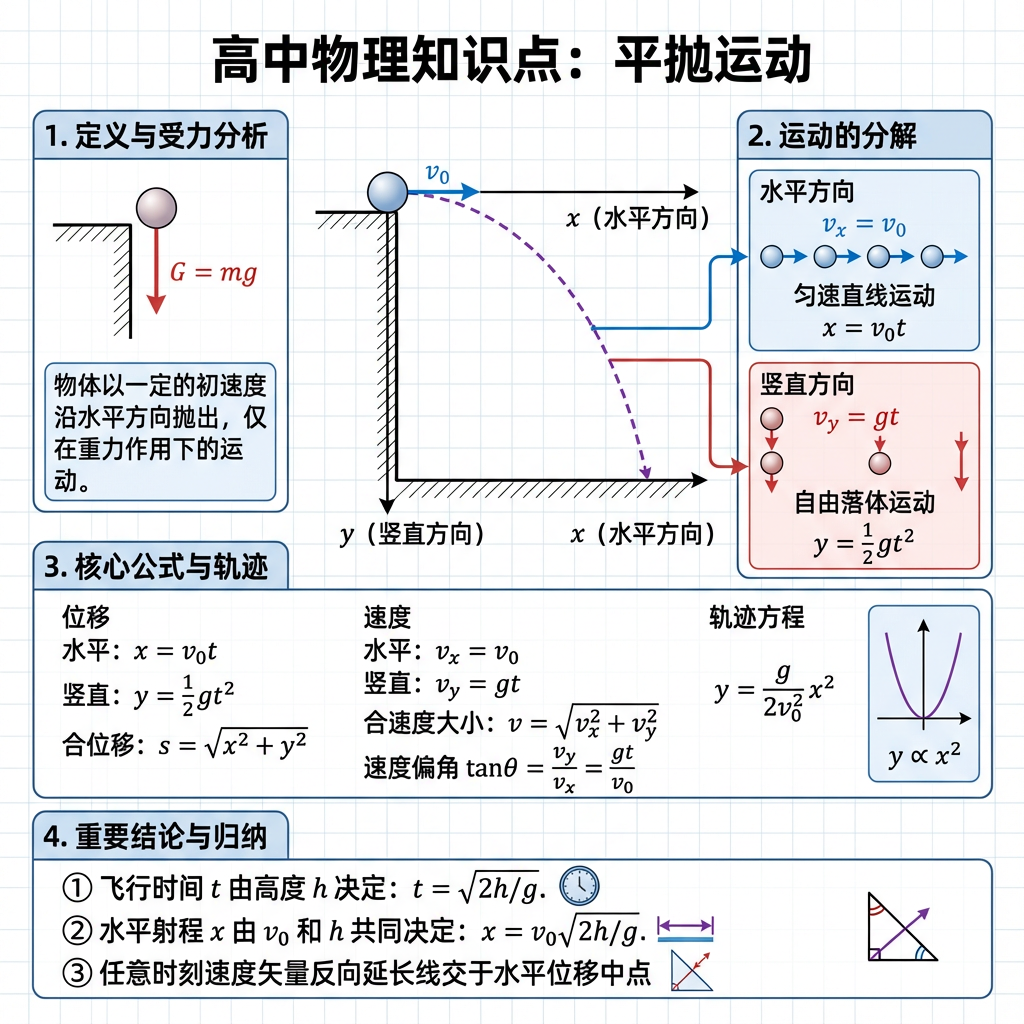 生成一个高中物理关于平抛运动的知识点讲解,要求知识点准确无误,采用科学的富有逻辑性的排版,可作为教科学进行讲解和归纳总结,方便学生使用 | Visualize