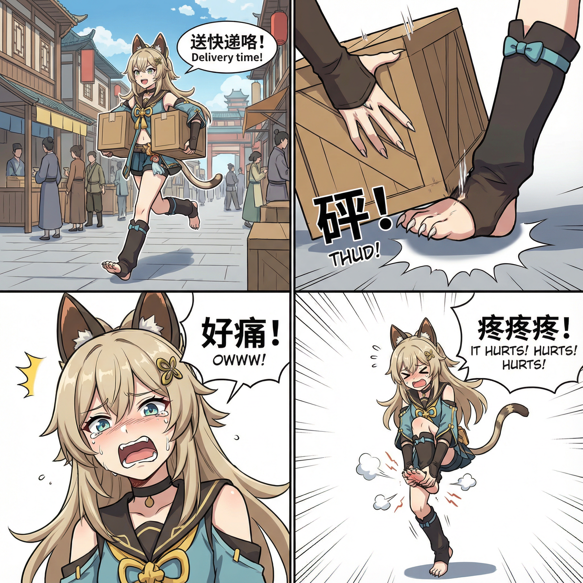 生成一个彩色风多格漫画,在原神的城镇场景里,第一格的画面是绮良良在去送快递的路上,第二格画面是绮良良受中的快递没拿稳掉下来砸到自己的右脚脚爪,第三格画面是绮良良表情痛苦,第四格画面是绮良良双手抱着被砸到的右脚脚爪,疼得单脚跳来跳去