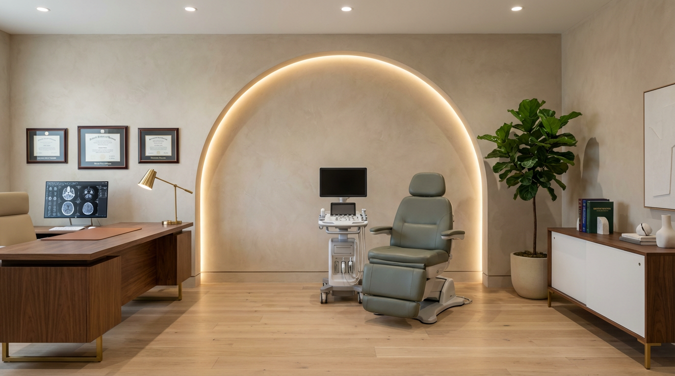 整体氛围与构图】:一张正面全景照片,展示一间高端、豪华的私人医生诊疗室。空间设计旨在作为专业的远程视频会议背景,既显赫又宁静。光线也是为了视频优化,层次丰富且柔和。\n\n【核心建筑特征】:保留原图标志性的大型弧形内凹墙面设计,内嵌暖色温的间接LED灯带,作为视觉中心和背景光。\n\n【材质升级】:墙面采用米灰色微水泥质感,地面升级为宽板欧洲白橡木地板。所有金属件(灯具、家具腿)采用拉丝黄铜材质,提升奢华感。\n\n【办公区 (视频前景)】:左侧是一张定制的胡桃木行政办公桌 。桌上放置着高级皮质桌垫、一台超薄的专业显示器(显示医学影像)、一盏设计感的黄铜台灯。关键细节: 桌后墙面整齐悬挂着三到四个精装裱的医学学位证书和执照,增加权威性。\n\n【诊疗区 (中景)】:中间放置一张看起来非常先进的电动多功能检查椅,采用灰绿色 或 深海蓝 的高级皮革包裹。旁边配备一个带有集成屏幕和精密仪器的移动医疗推车 。\n\n【陈列与平衡 (右侧)】:右侧的储物柜升级为定制的胡桃木与白色烤漆结合的矮柜。上面的植物更换为姿态更优雅的大型琴叶榕 放置在陶瓷盆中。柜面上精心摆放着几本厚重的医学精装书和极简的艺术品,而非杂乱的文件夹。\n\n【画质要求】:4K分辨率,照片级真实感,建筑杂志摄影风格,16:9比例。