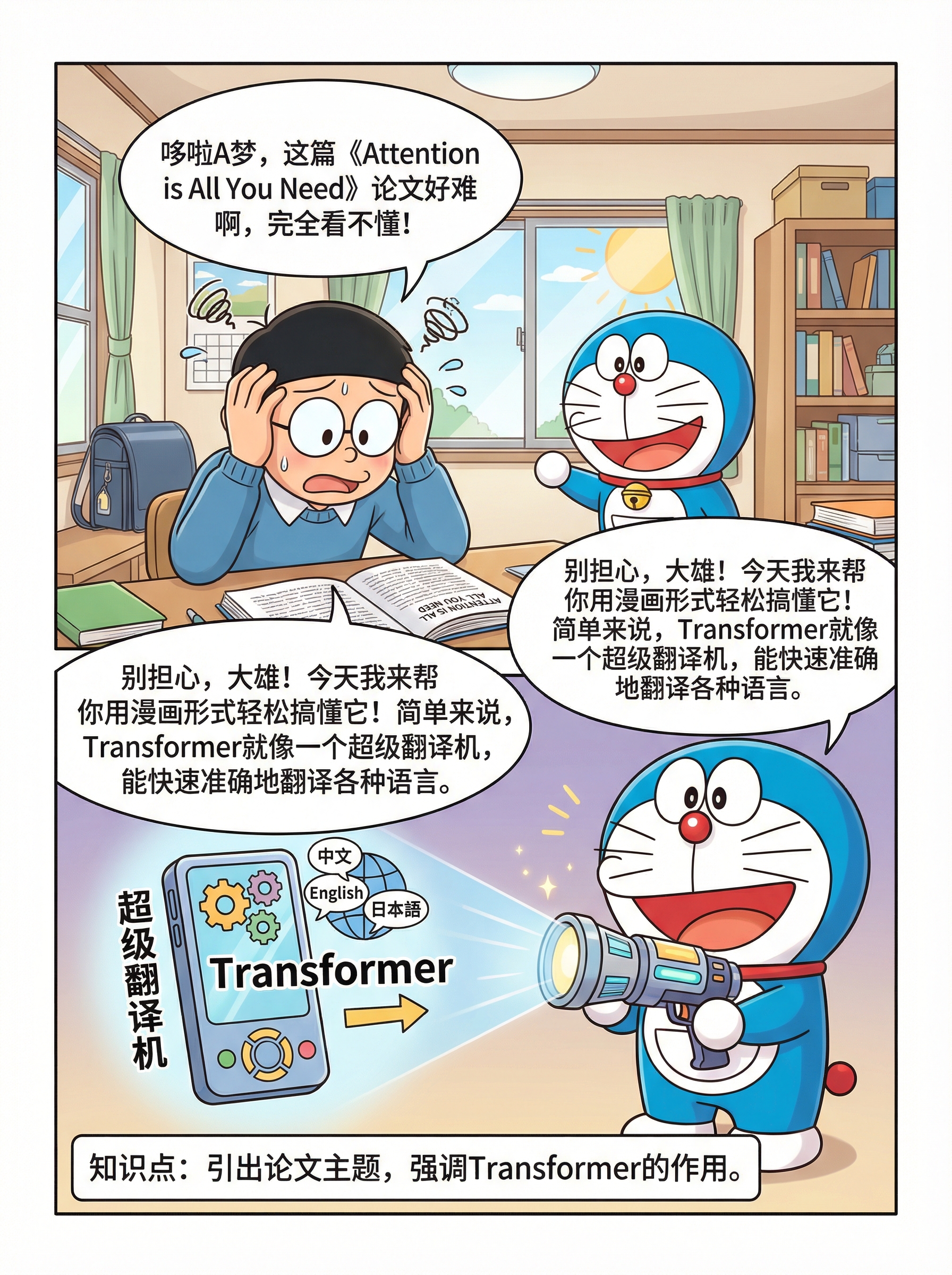 Page 1: 大雄:哆啦A梦,这篇《Attention is All You Need》论文好难啊,完全看不懂! 哆啦A梦:别担心,大雄!今天我来帮你用漫画形式轻松搞懂它!简单来说,Transformer就像一个超级翻译机,能快速准确地翻译各种语言。 知识点:引出论文主题,强调Transformer的作用。
