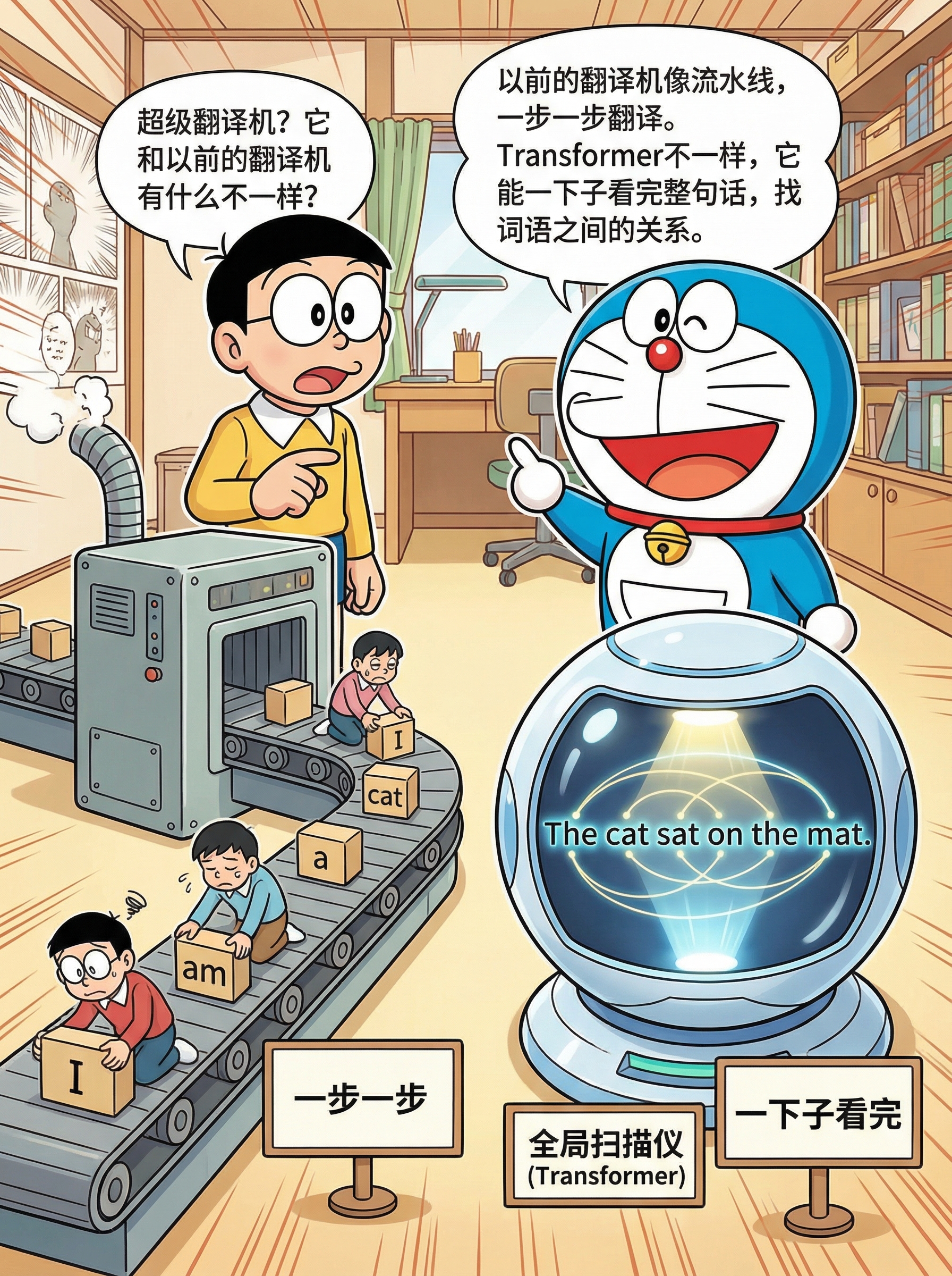 Page 2: 大雄:超级翻译机?它和以前的翻译机有什么不一样? 哆啦A梦:以前的翻译机像流水线,一步一步翻译。Transformer不一样,它能一下子看完整句话,找出词语之间的关系。 知识点:对比传统翻译模型和Transformer模型的区别,强调Transformer的全局性。 大雄:怎么一下子看完整句话呢?