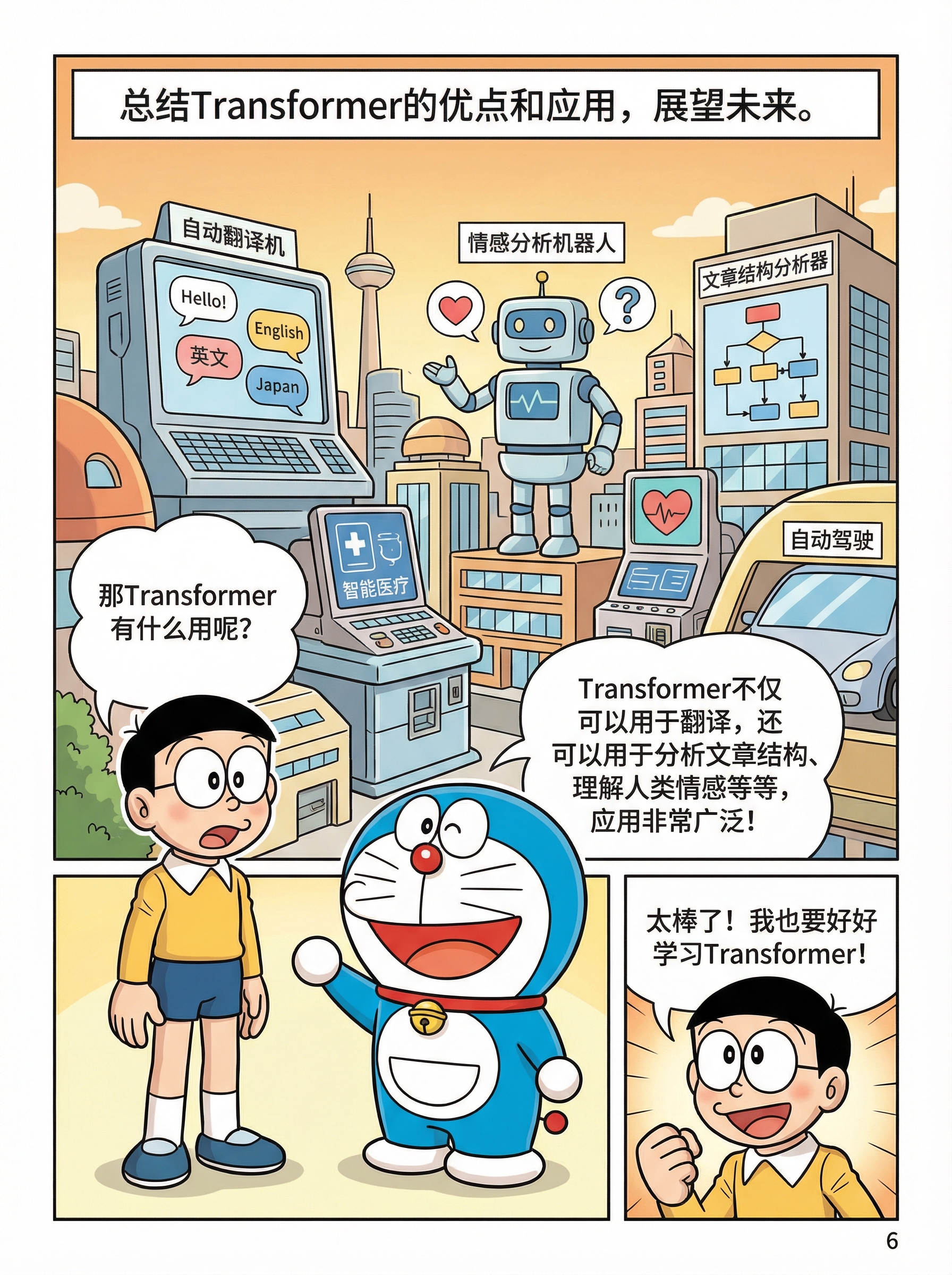 Page 6: 大雄:那Transformer有什么用呢? 哆啦A梦:Transformer不仅可以用于翻译,还可以用于分析文章结构、理解人类情感等等,应用非常广泛! 知识点:总结Transformer的优点和应用,展望未来。 大雄:太棒了!我也要好好学习Transformer!